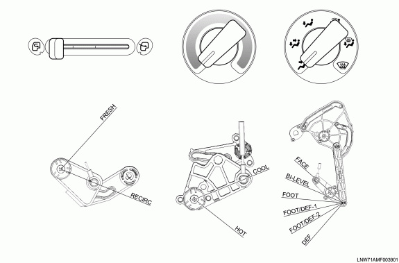 - Set the mode control link of the heater unit (mode door) to the "FACE" position, connect the control cable and fasten it to the lock clamp.