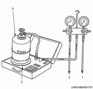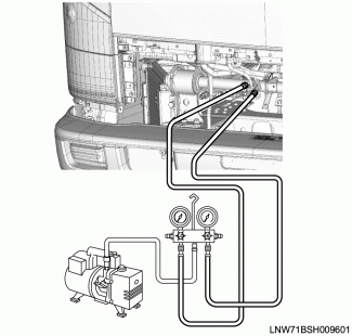 Notice: Explained below is a method using a vacuum pump. Refer to the ACR4 manufacturer's instructions when evacuating the system with a ACR4. Air and moisture in the refrigerant will cause problems in the air conditioning system. Therefore, before charging the refrigerant, be sure to evacuate air and moisture thoroughly from the system.