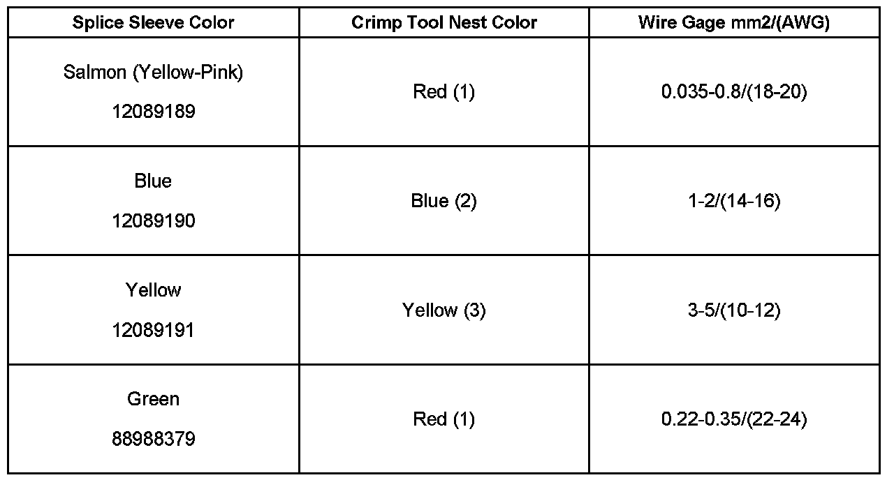 6. Select the proper DuraSeal splice sleeve according to the wire size. Refer to the above table at the beginning of the repair procedure for the color coding of the DuraSeal splice sleeves and the crimp tool nests.