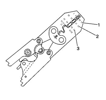 7. Use the Splice Crimp Tool from the J-38125 in order to position the DuraSeal splice sleeve in the proper color nest of the Splice Crimp Tool. The crimp tool has three nests, 1 is for the salmon and green splice sleeve, 2 is for the blue splice sleeve, and 3 is for the yellow splice sleeve.