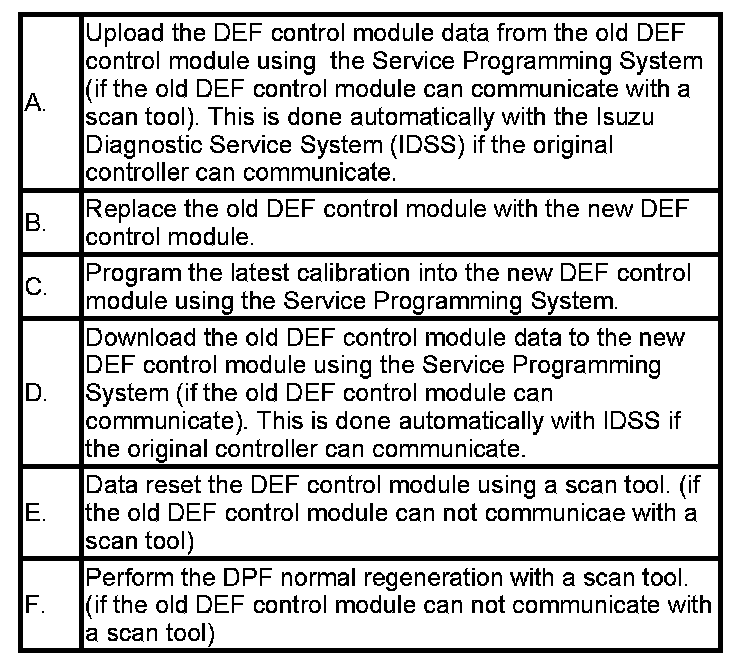 The current DEF control module data can be uploaded using the Service Programming System. If the old DEF control module cannot communicate with a scan tool, go to Step B. Follow the Isuzu Diagnostic Service System (IDSS) onscreen instructions under Controller Programming -- Diesel Exhaust Fluid Control Module -- Software and Calibrations -- Replace and Reprogram Controller. IDSS will AUTOMATICALLY upload the DEF control data from the old DEF control module.