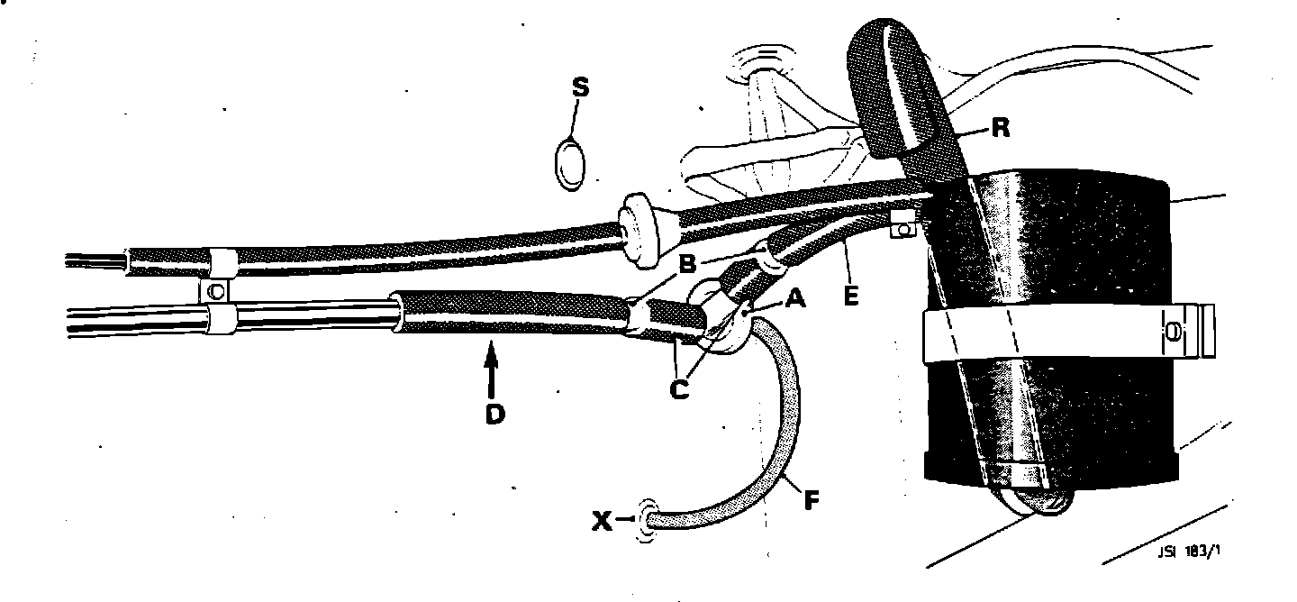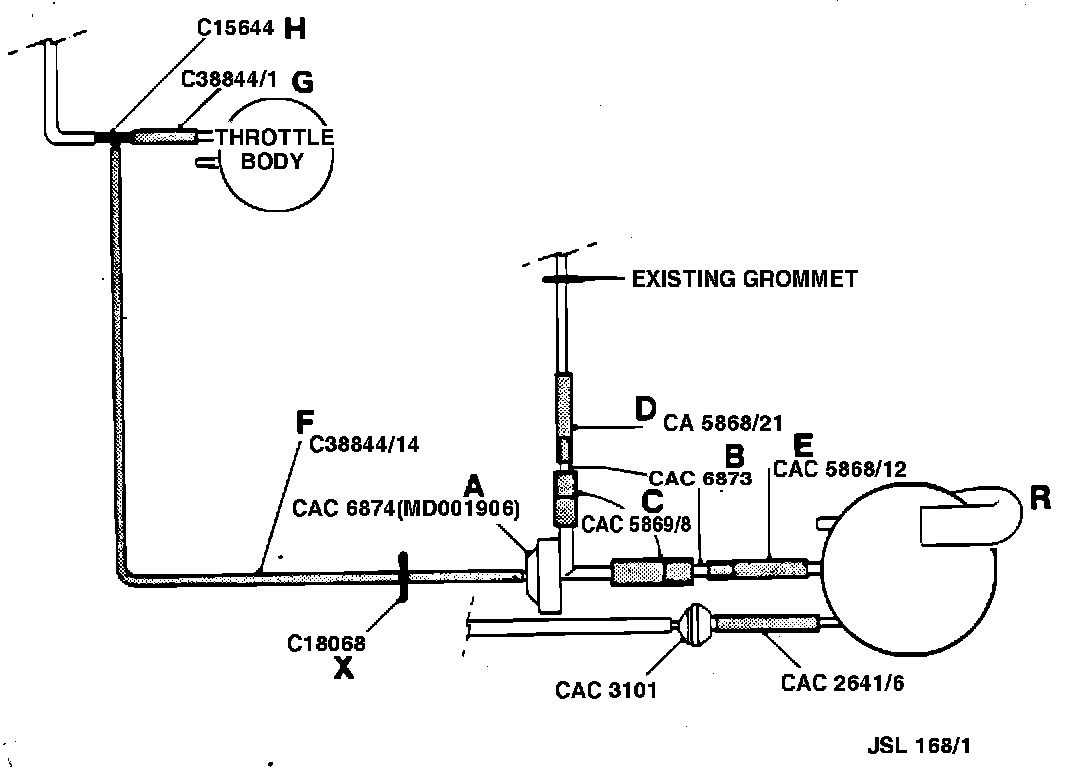 7. Connect breather hose, D, to the metal engine breather pipe, and route the long vacuum hose through the grommet fitted in operation 4.