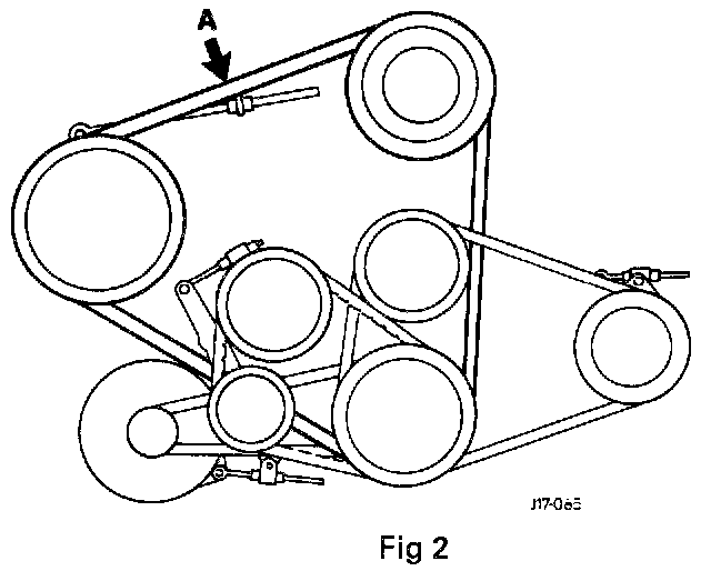 Fit the pump pulley. Fit the drive belt. Adjust the belt tension by the adjusting link nut. Correct tension is as follows: A load of 6.4 lb (2,9kg) must give a total belt deflection of 0.22 in (5,6 mm) when applied at point A Fig. 2.