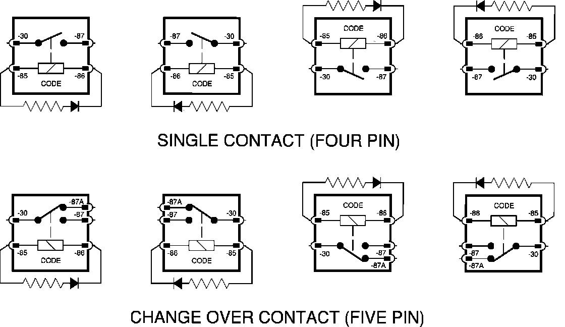 The illustration shows the two types of relays used in the vehicles and their various arrangements on the diagrams. The pin identifications remain the same regardless of the arrangement. The connector code should appear in the area indicated.