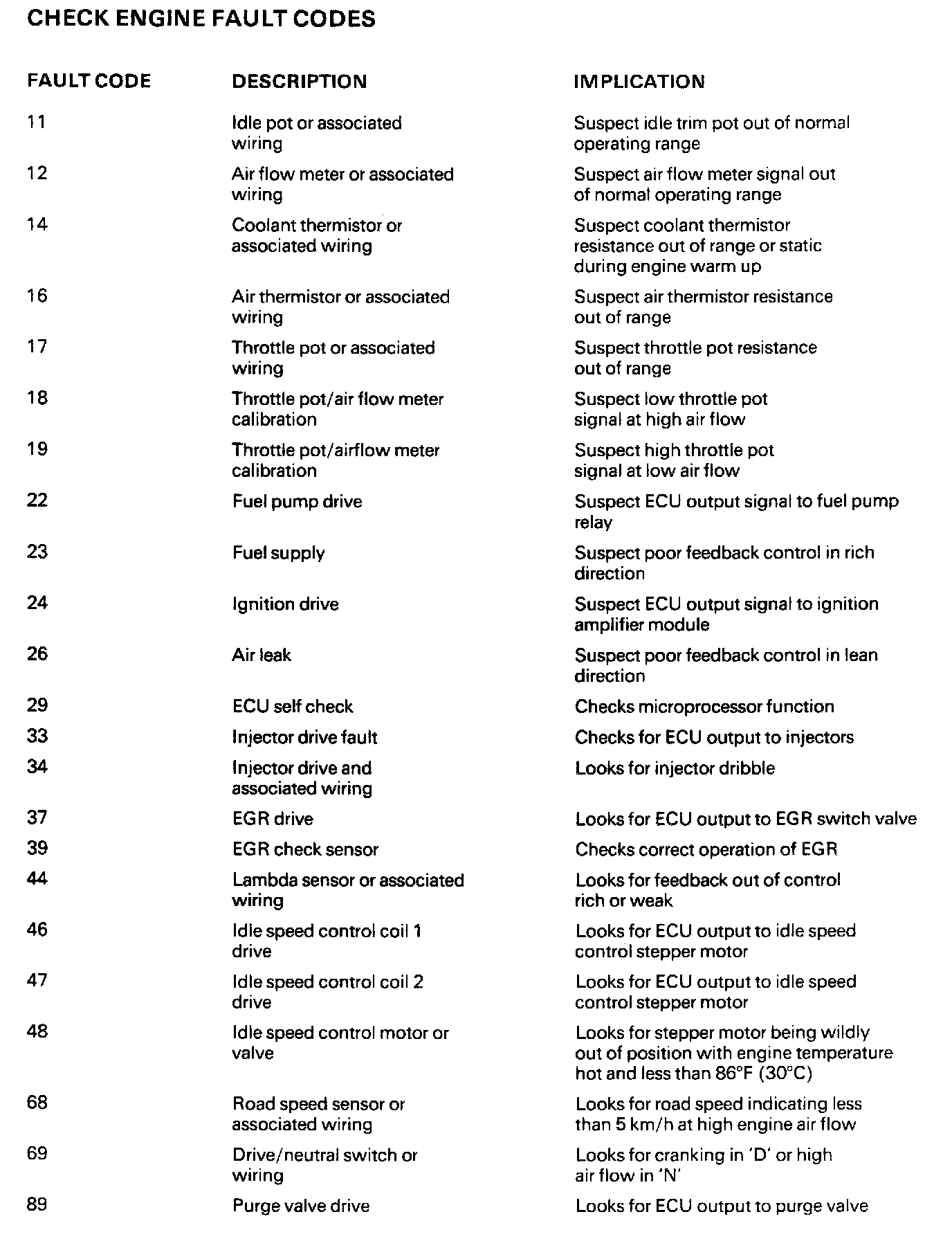 All fault codes are, when triggered, stored in the ECU memory. In addition, the 'check engine' lamp is illuminated, and will remain illuminated (when the ignition is switched on) until the fault is rectified and the ECU memory cleared by JDS or by grounding the relevant ECU pin (see notes for exceptions).