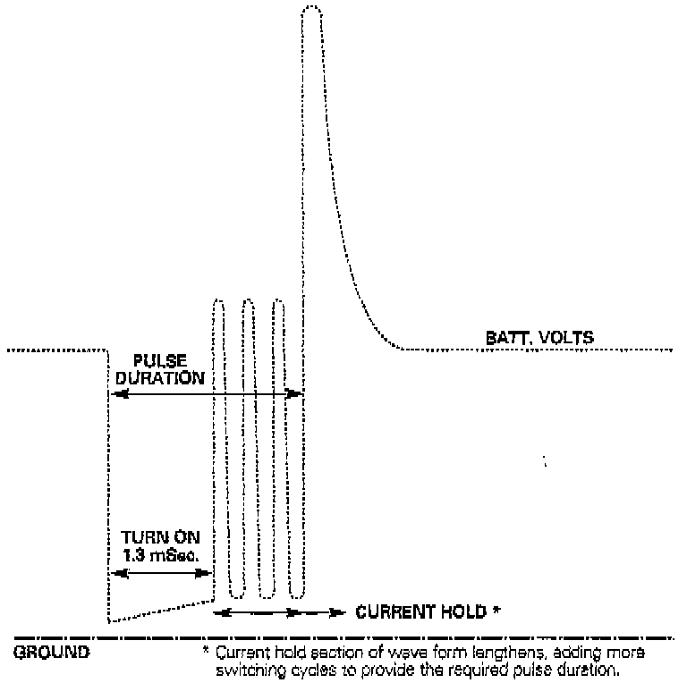 All fuel injectors are pulsed simultaneously by the ECM "output stage". To reduce power consumption, the current drawn by the injectors is controlled by the ECM. The injectors are opened by a relatively large "turn on" pulse and are held open for the required duration by a series of smaller "hold on" pulses.