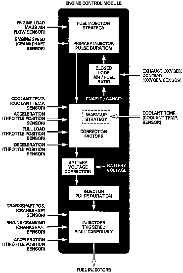 FUEL INJECTION SYSTEM DESCRIPTIONFuel metering is obtained by controlling the injector pulse duration during each engine revolution. The pulse duration is varied by the engine control module (ECM) according to several sensor inputs. The sensed control inputs form two groups - primary and secondary Primary control inputs are intake mass air flow (engine load) and engine speed; secondary control inputs consist of engine coolant temperature, cranking signal, throttle movement and position and exhaust oxygen content. The injector pulse is then trimmed for battery voltage. Except during "cranking" and rapid throttle application, all six injectors are pulsed once per engine revolution (twice per engine cycle). Half of the fuel requirement is delivered at each pulse and the pulse duration is recalculated before each succeeding injection.