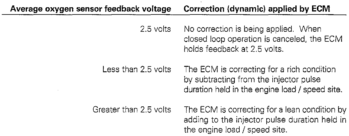 In response to the oxygen sensor voltage, the ECM continuously drives the air/fuel ratio rich-lean-rich by adding to, or subtracting from, the injector pulse duration determined from the main fuel metering strategy.