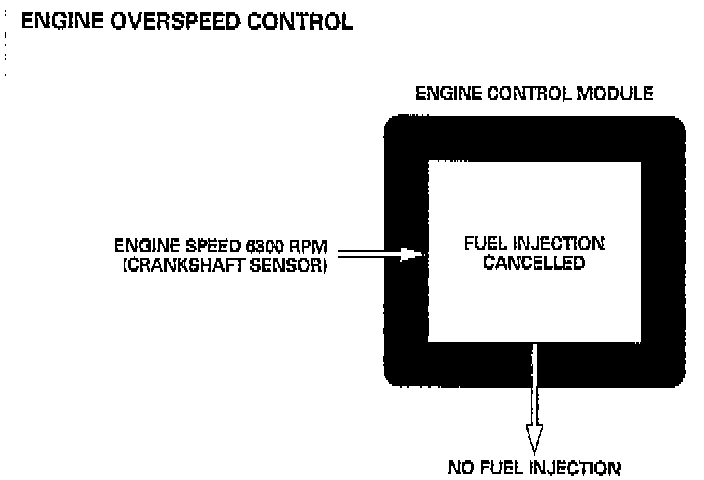 An engine overspeed control function limits the maximum engine speed to 6300 rpm by canceling fuel injection. Fuel injection is reinstated at a slightly lower engine speed.