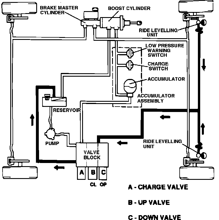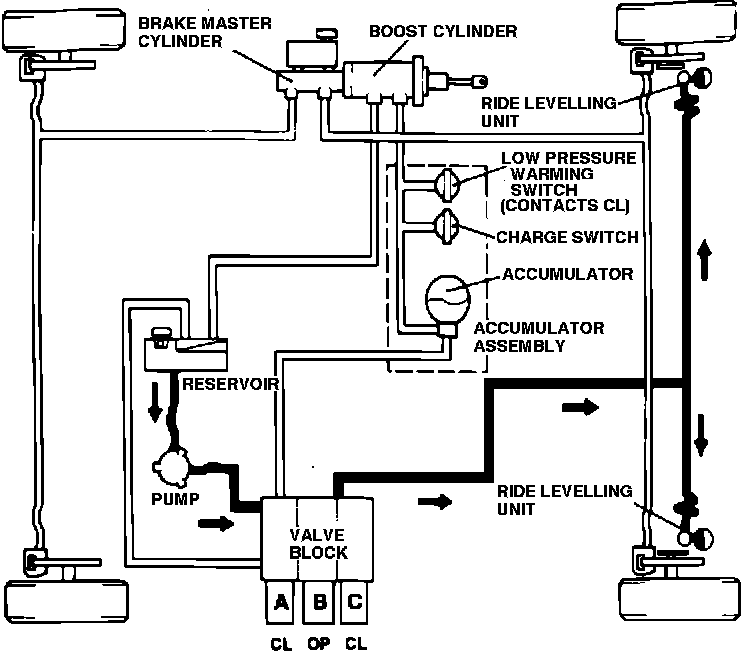 "Up" leveling is blocked and brake accumulator charging is prioritized when accumulator pressure is low (1988 and 1989 models only). The low pressure warning switch contacts open and isolate the suspension relay, preventing the up solenoid valve from being energized (Fig. 2).