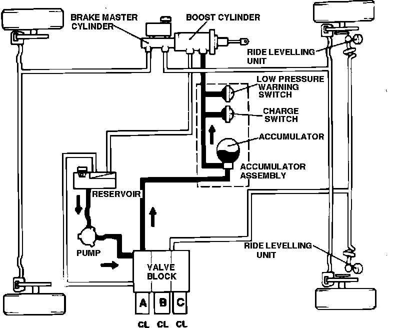 The "charge switch" at the brake accumulator senses brake boost pressure. When the pressure is low, the charge switch contacts close, the charge valve solenoid is energized and the charge solenoid valve closes the return orifice to the reservoir. The system builds pressure which forces open a non-return valve in the accumulator and the accumulator is charged with fluid (Fig. 2). When the correct pressure is reached, the charge switch contacts open, the charge valve solenoid is de-energized and fluid is diverted back to the reservoir.