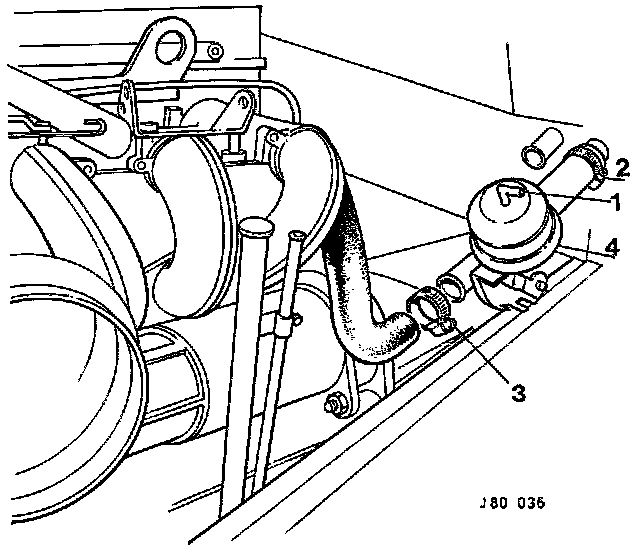 6. Loosen the water valve to cylinder head hose clip (3), and remove the water valve assembly (4).