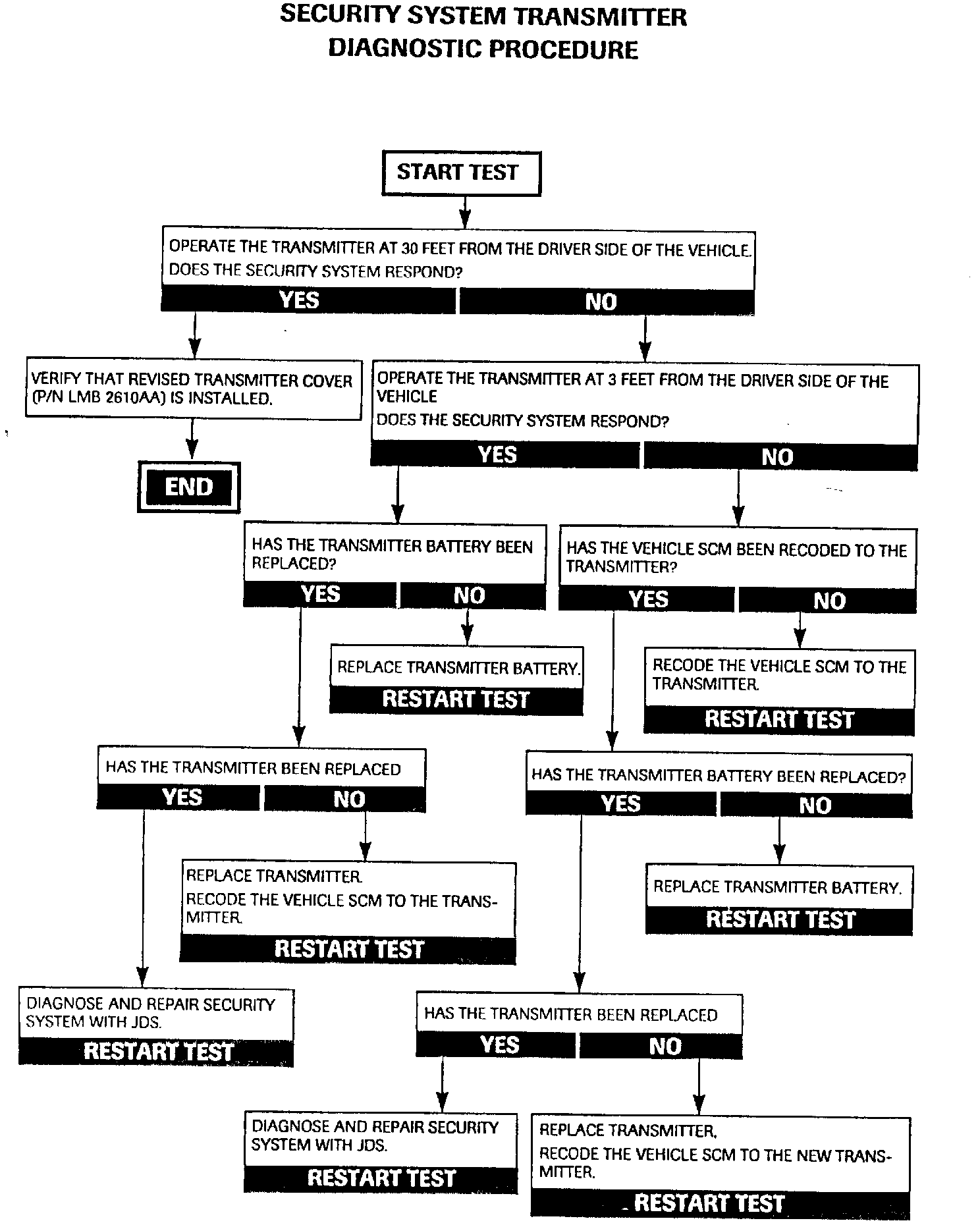 If customers complain that the security system transmitter operates the system intermittently, not at all, or its range is consistently below 30 feel perform the Security System Diagnostic Procedure.