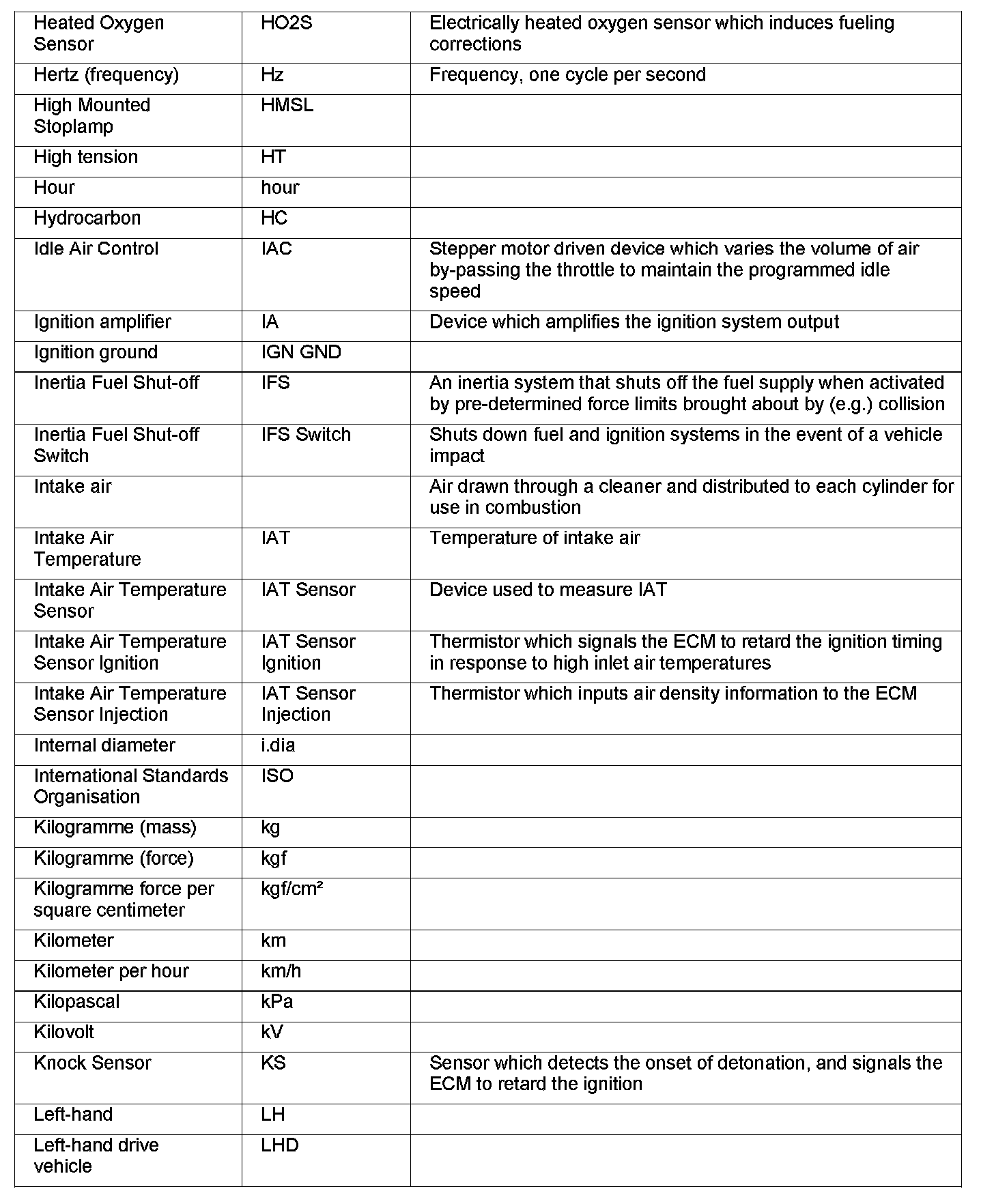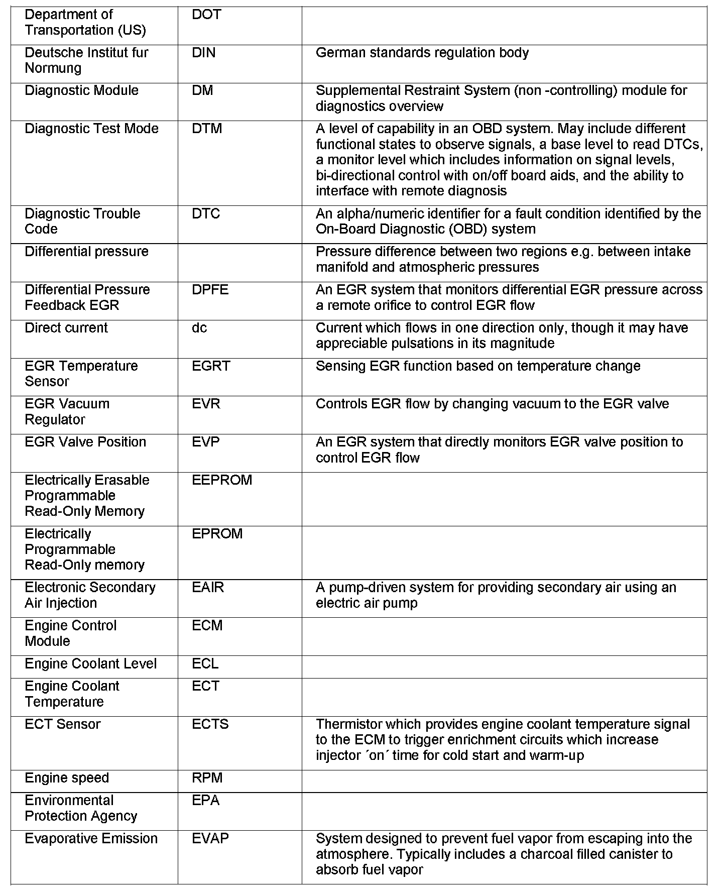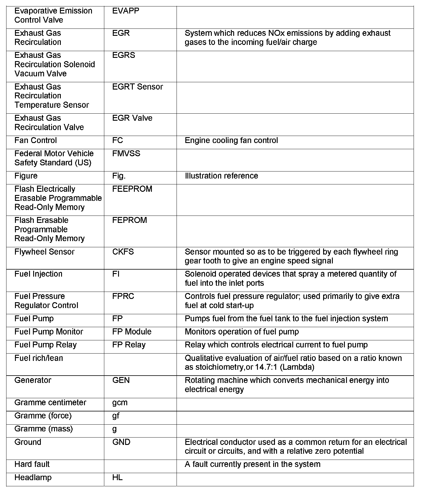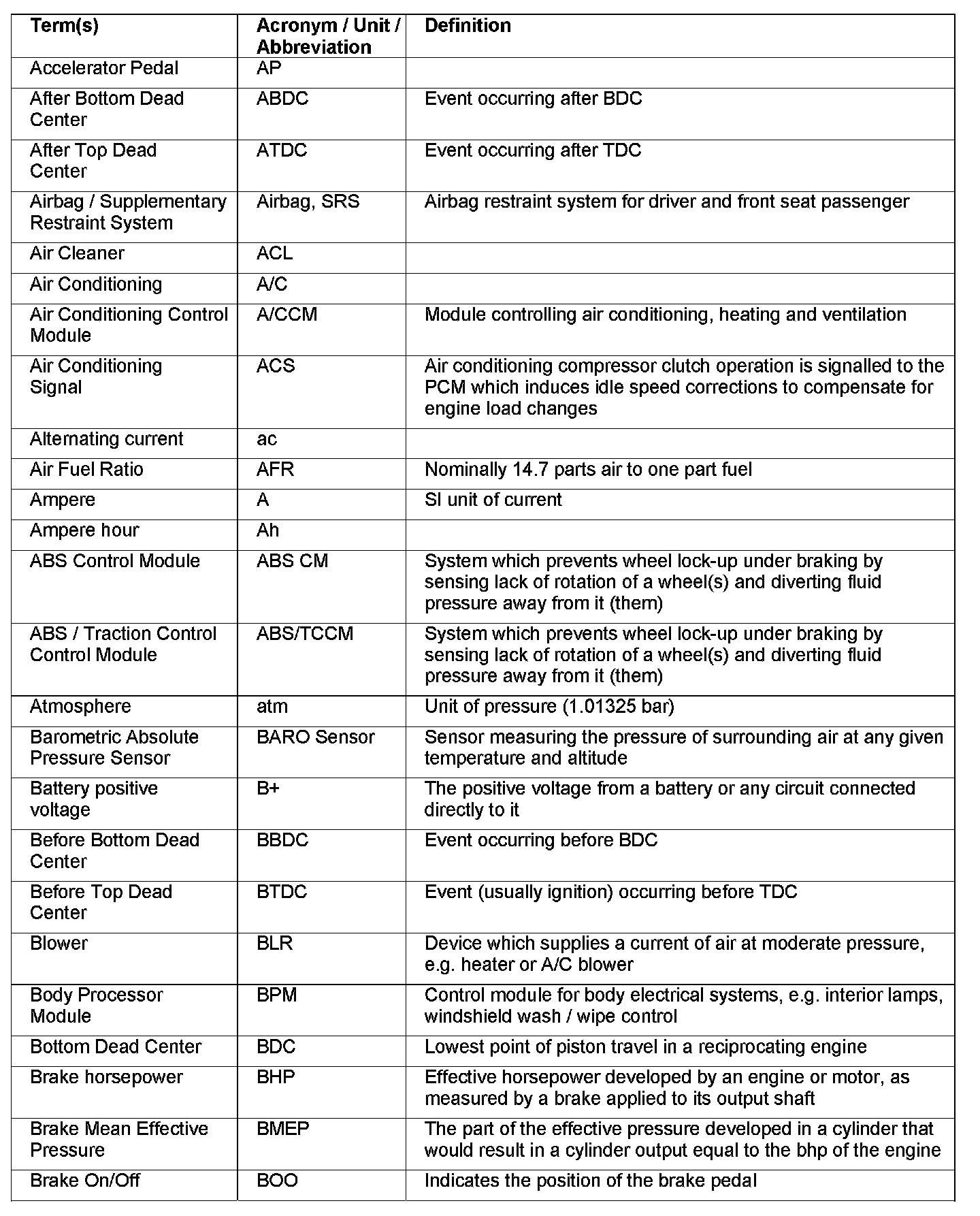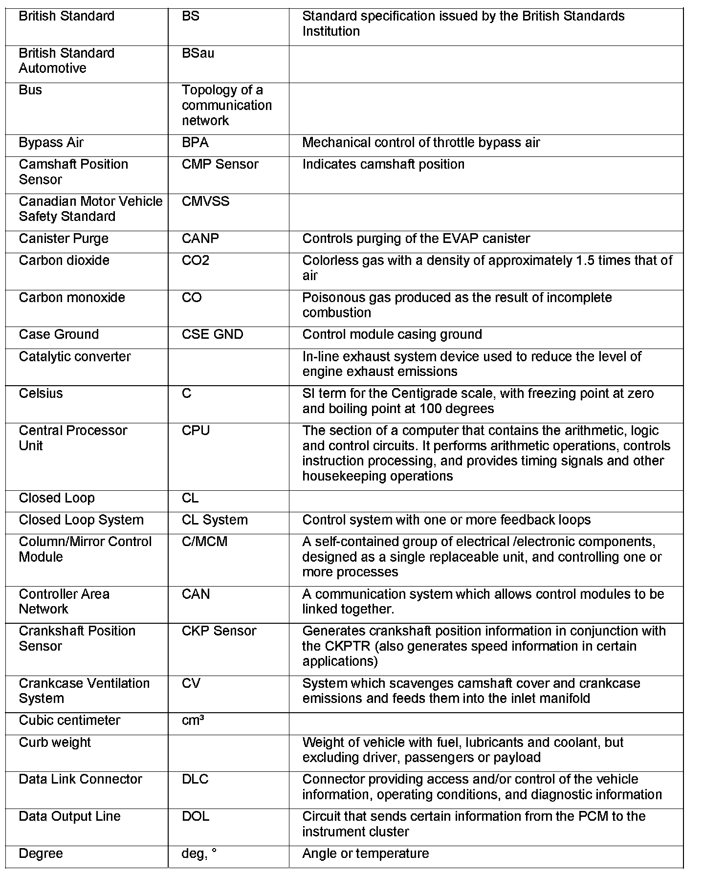 This glossary of terms is intended to cover mainly emissions-related (to SAE J 1930) terminology, and other abbreviations that may be used in this manual.