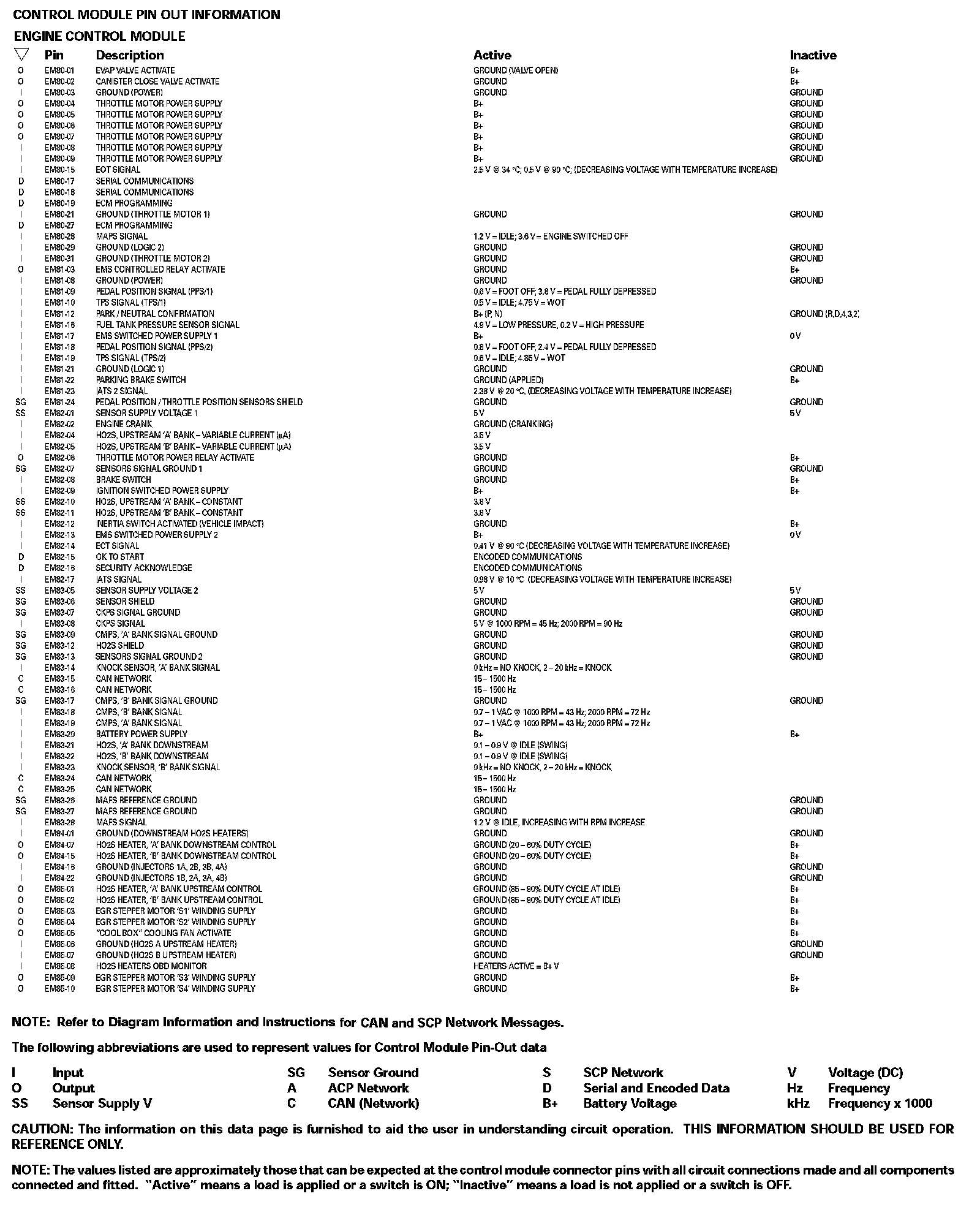 Control Module Pin Out Information: