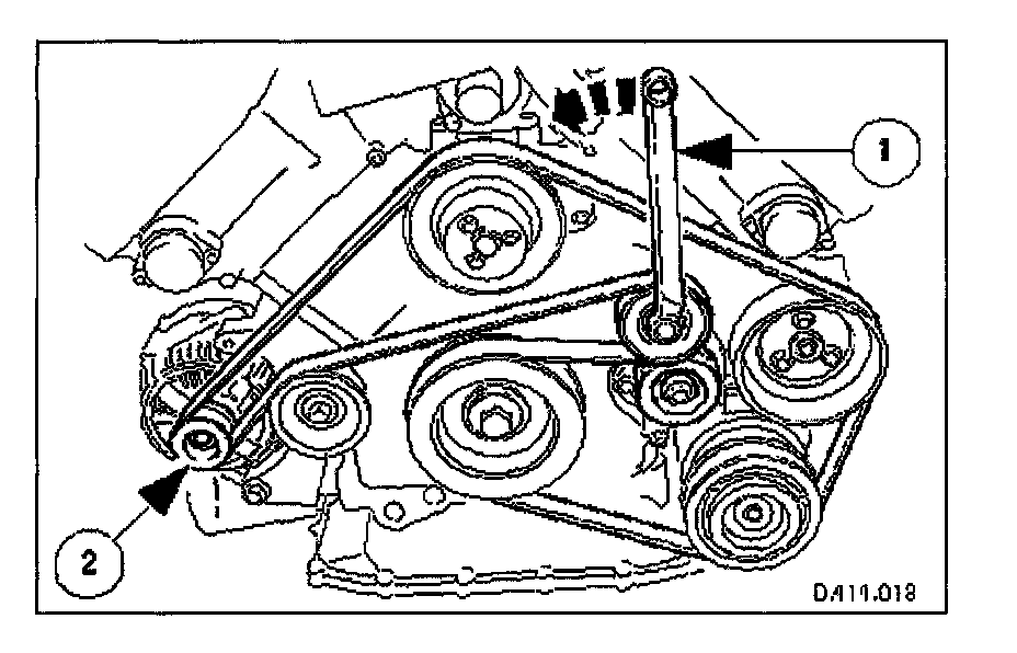 1. Use a spanner e.g. Churchill JD-230 or Snap On XDHM 1415, on the centre bolt of the belt tensioner idler pulley, to turn the adjuster assembly to the left against spring tension. Whilst holding the tensioner against spring tension, remove the drive belt from the generator pulley. Release the tensioner slowly and remove the spanner.