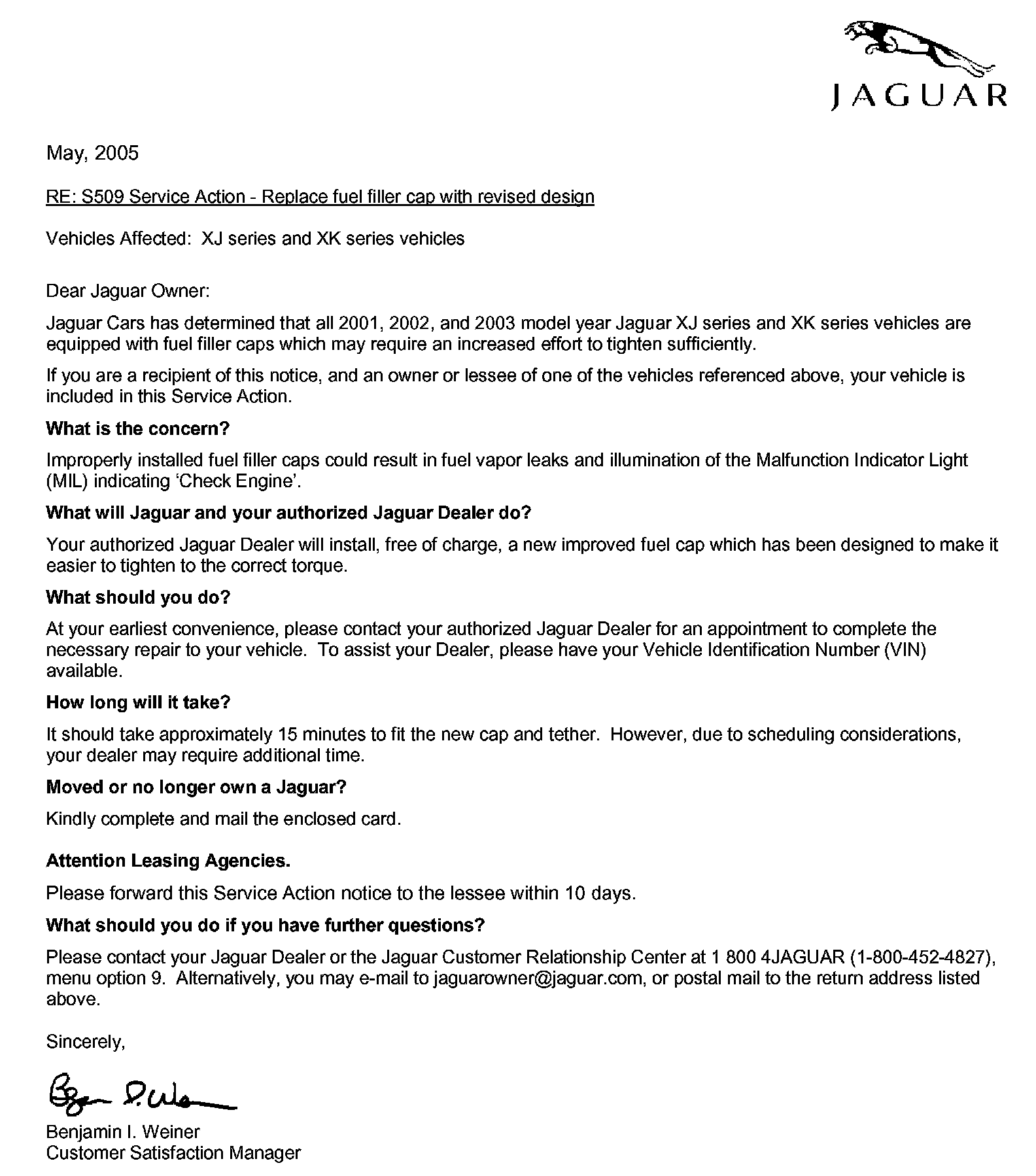 *Jaguar Cars will be contacting owners of affected vehicles. A copy of the revised customer letter is included for reference.*