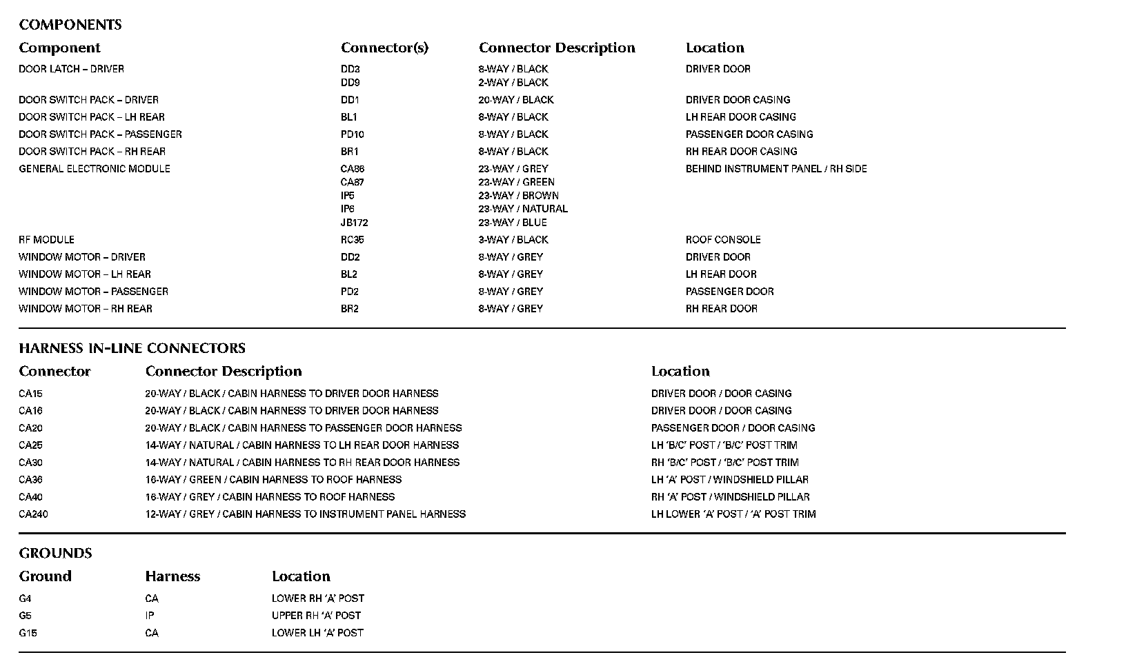 Locations: The location views for Ground Points, In-Line Harness Connectors, Harnesses, and Control Modules depicted within these diagrams can be found at Vehicle/Locations. Locations