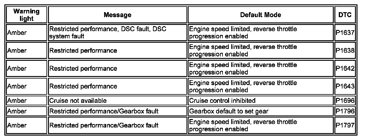 NOTE: If any warning lights and/or messages were displayed when the fault occurred, refer to the driver information table for DTCs associated with the display, then to the DTC index table for possible sources and actions. Some warnings will appear to clear when the ignition is cycled. This is often because the warning has flagged as a result of one of the vehicle's on-board diagnostic routines having run to detect the fault. If the same routine is not run when the ignition is switched ON, the warning will not reflag until the routine does run. See the DTC summaries for drive cycle routines.