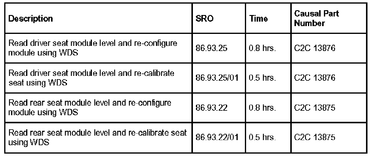 Some 2004 MY XJ range vehicles within the above VIN range, may exhibit a concern regarding loss of seat memory. Depending on the part number suffix of the vehicle's driver seat module (DSM) or rear memory module (RMM), may need to be reconfigured, or the seat recalibrated using the Worldwide Diagnostic System (WDS).