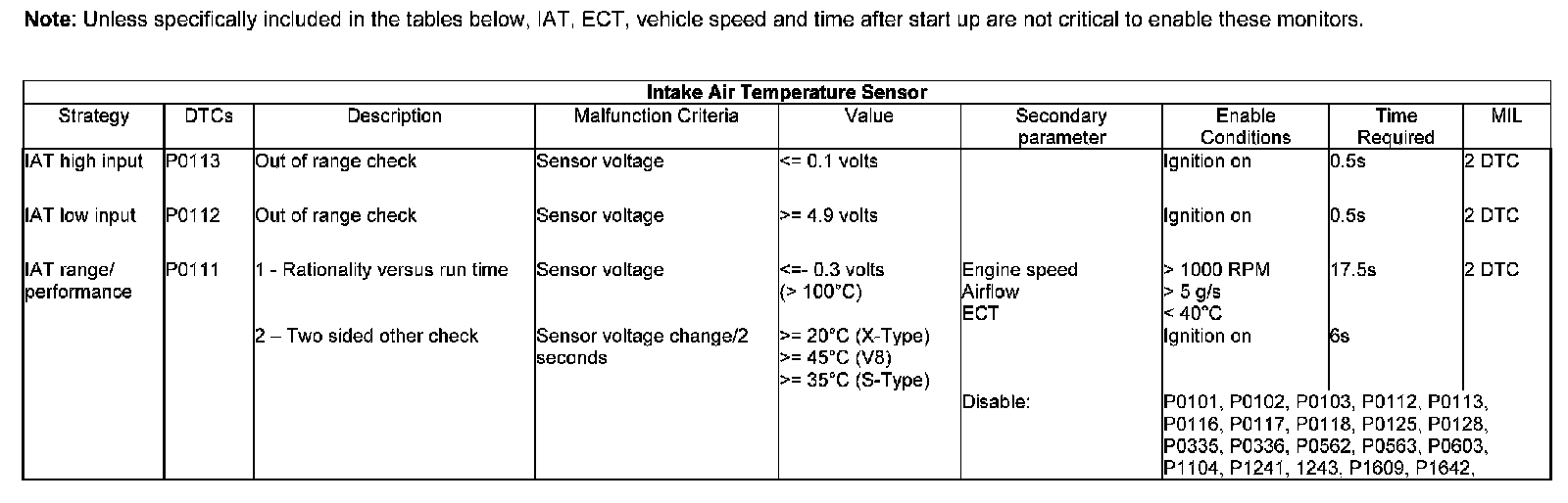 If engine speed and intake airflow is sufficient, the ECT is low enough and the air temperature sensor voltage is lower than calibrated constants, then a monitoring failure judgment is made.