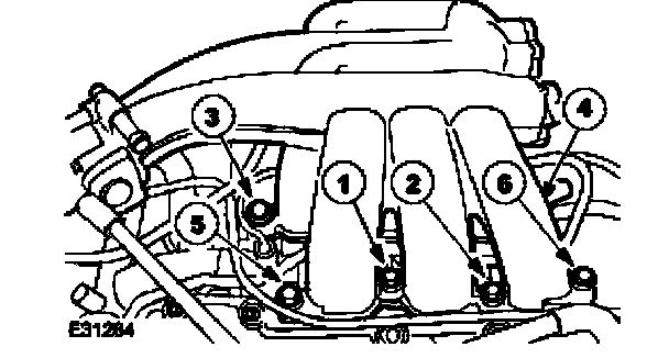 Intake ManifoldNOTE: The intake manifold retaining bolts in position 1, 4 and 5 are longer than the retaining bolts in position 2, 3 and 6.