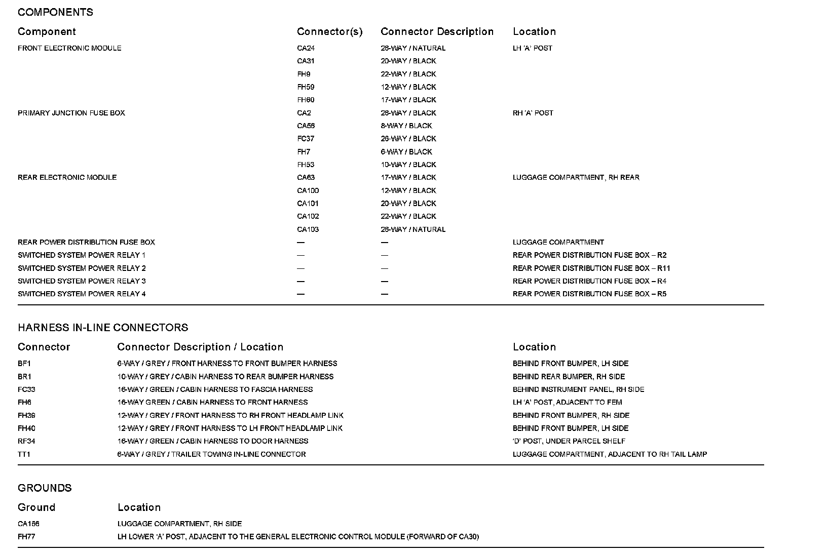 Locations: The location views for Ground Points, In-Line Harnesses, and Control Modules depicted within these diagrams can be found at Vehicle/Locations. Locations