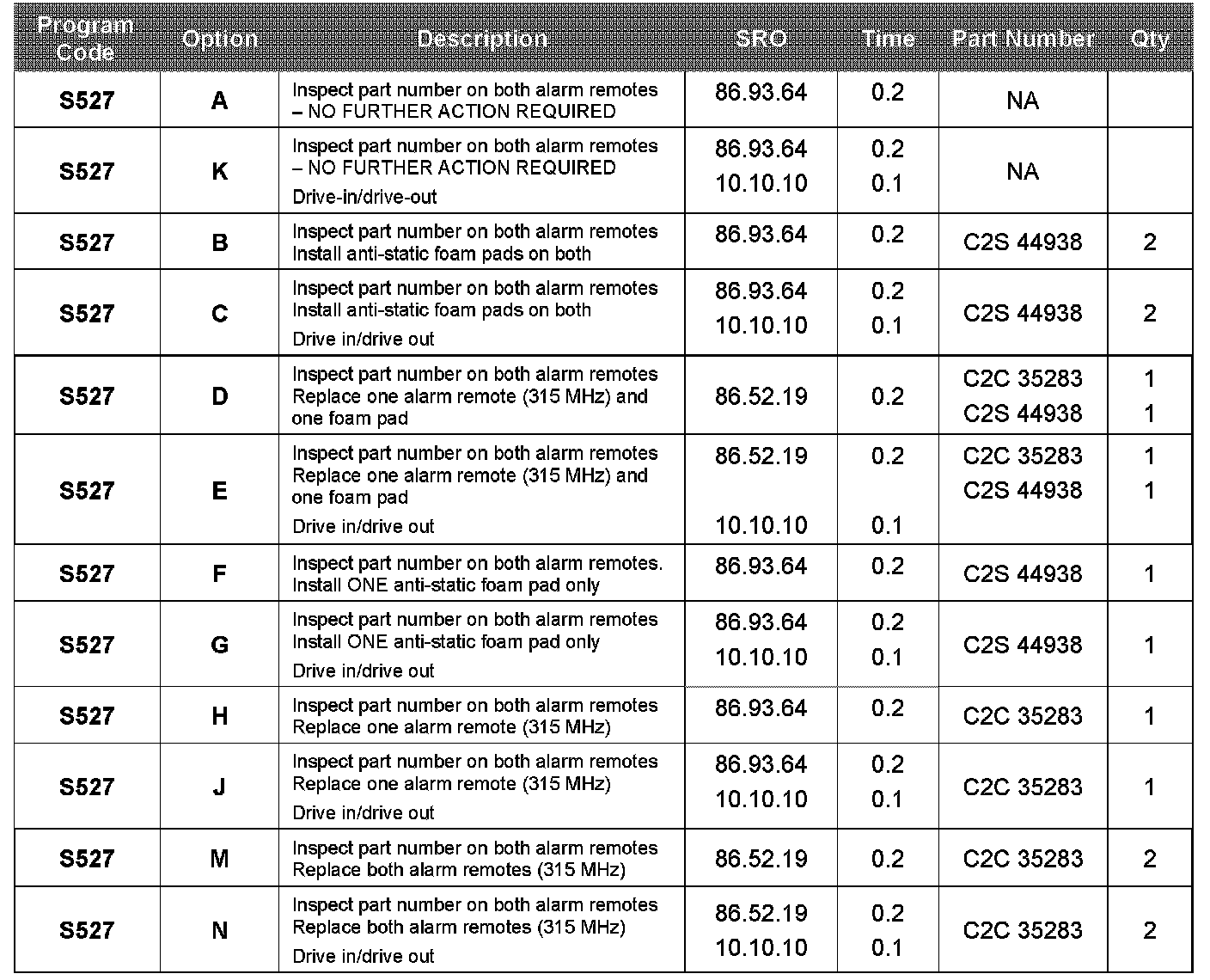 Warranty claims should be submitted quoting program code S527 together with the relevant option code. This will result in payment of the stated time and payment for the parts included. As option codes are used, there is no requirement to enter part numbers or SROs. These are repeated here for information only.