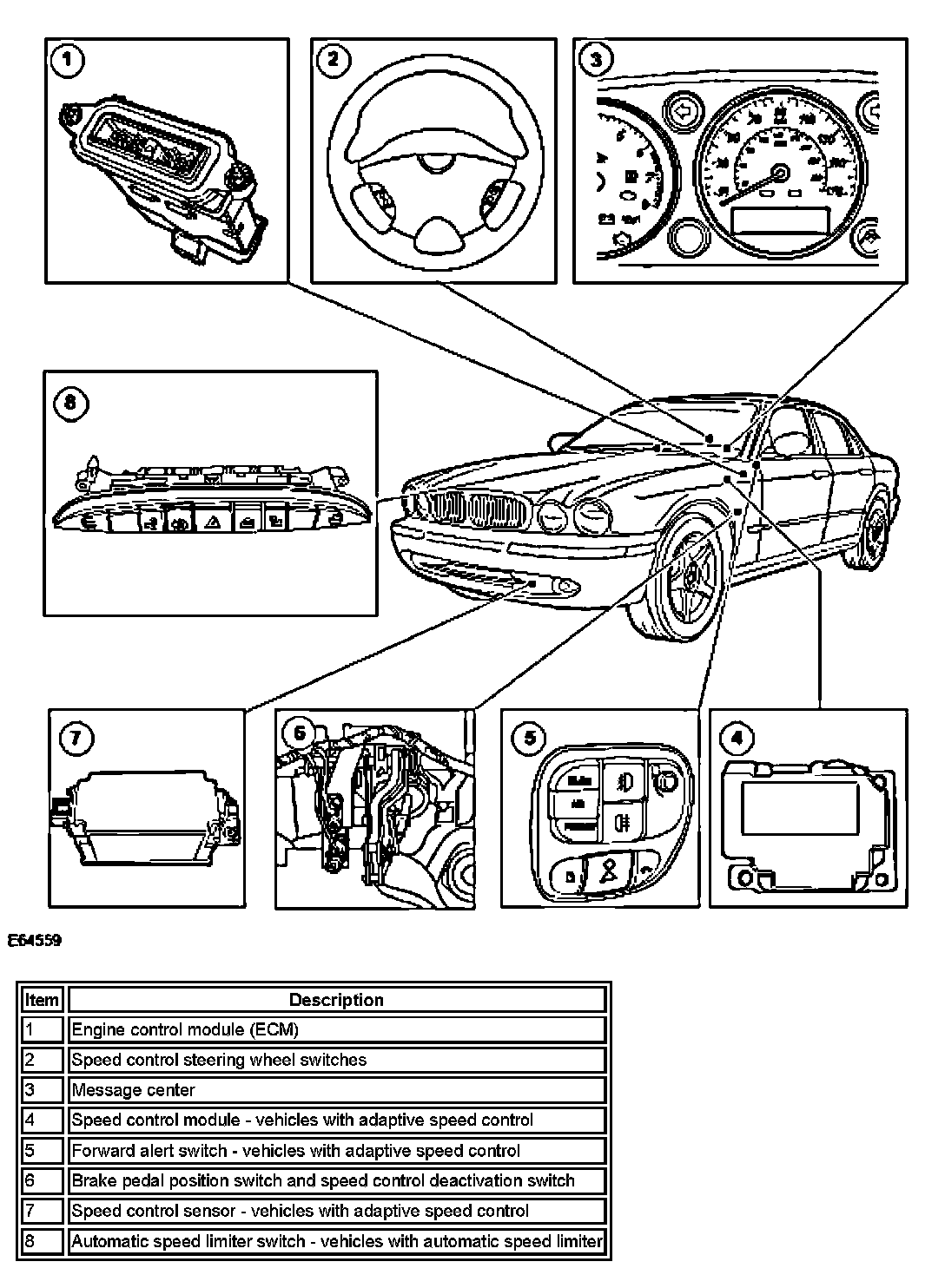 On vehicles for certain markets, an adaptive speed control system is installed as an option. In addition to the normal vehicle speed control functions, this system enables a preset distance to be maintained behind a moving vehicle immediately ahead, without driver intervention.