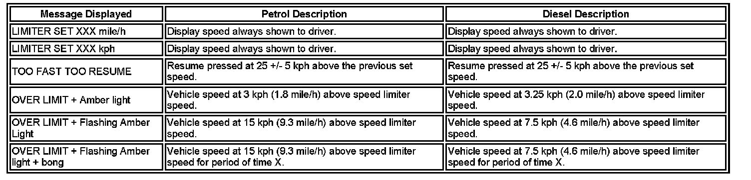 The automatic speed limiter enables the vehicle speed to be limited. The vehicle speed is selected from the message center, the ECM limits the throttle response and stops the vehicle from accelerating over the preset speed limit.
