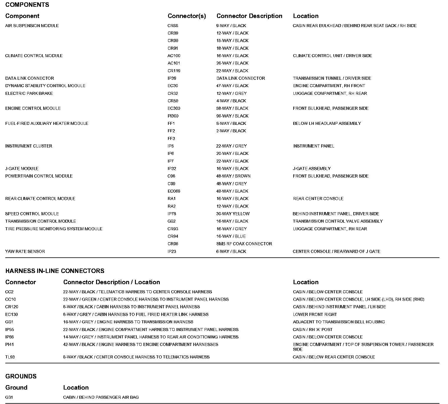 Locations: The location views for Ground Points, In-Line Harness Connectors, Harnesses, and Control Modules depicted within these diagrams can be found at Vehicle/Locations. Locations