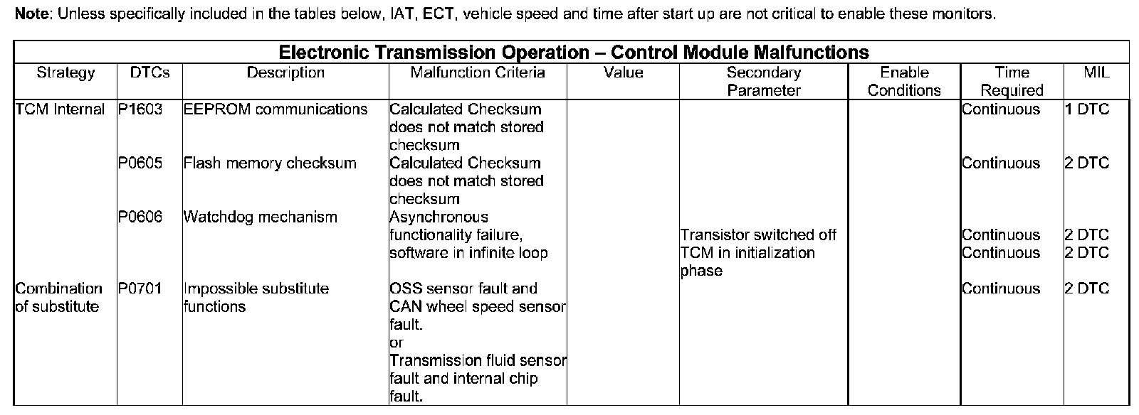 To diagnose errors with the Electrically Erasable Programmable Read Only Memory (EEPROM) the TCM calculates 4 checksums continuously: If the processor identifies discrepancies in any of the four checksums the TCM will engage mechanical limp-home mode.