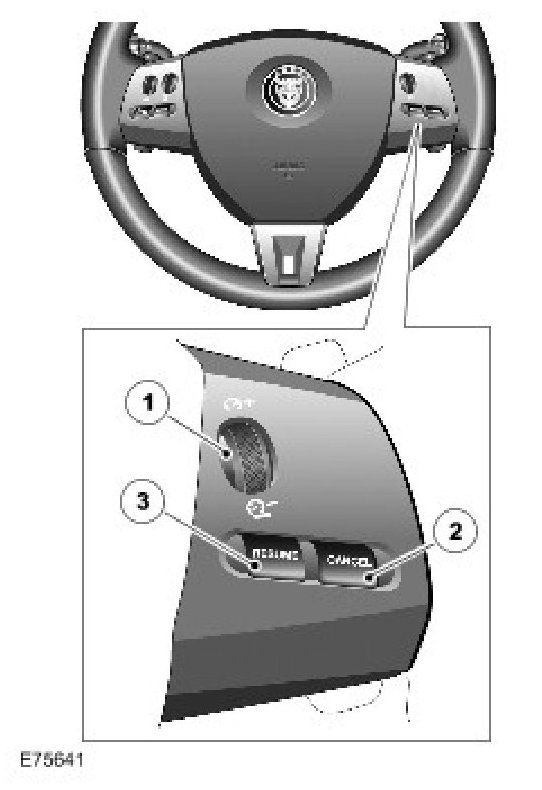 The speed control switches are located on the RH (Right-hand) side of the steering wheel. The switches are connected via fly leads to the clock spring. The speed control switches are resistive ladder type switches which vary the resistance of a 5 volt signal sent to them. The signal is returned along a Lin bus to the instrument cluster. The instrument cluster routes the control signals to the ECM on the MS CAN.