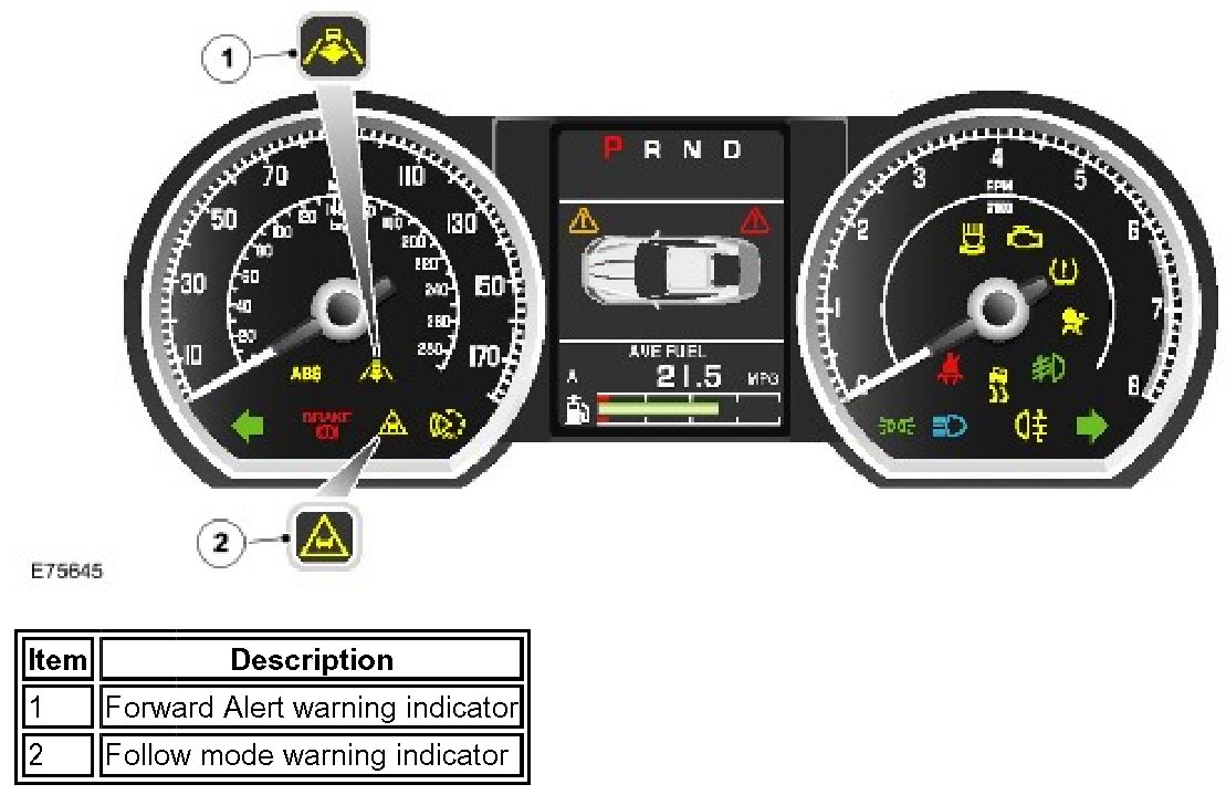 When the vehicle is in follow mode the follow mode warning indicator is illuminated in the instrument cluster and the current gap setting will be displayed in the message center.