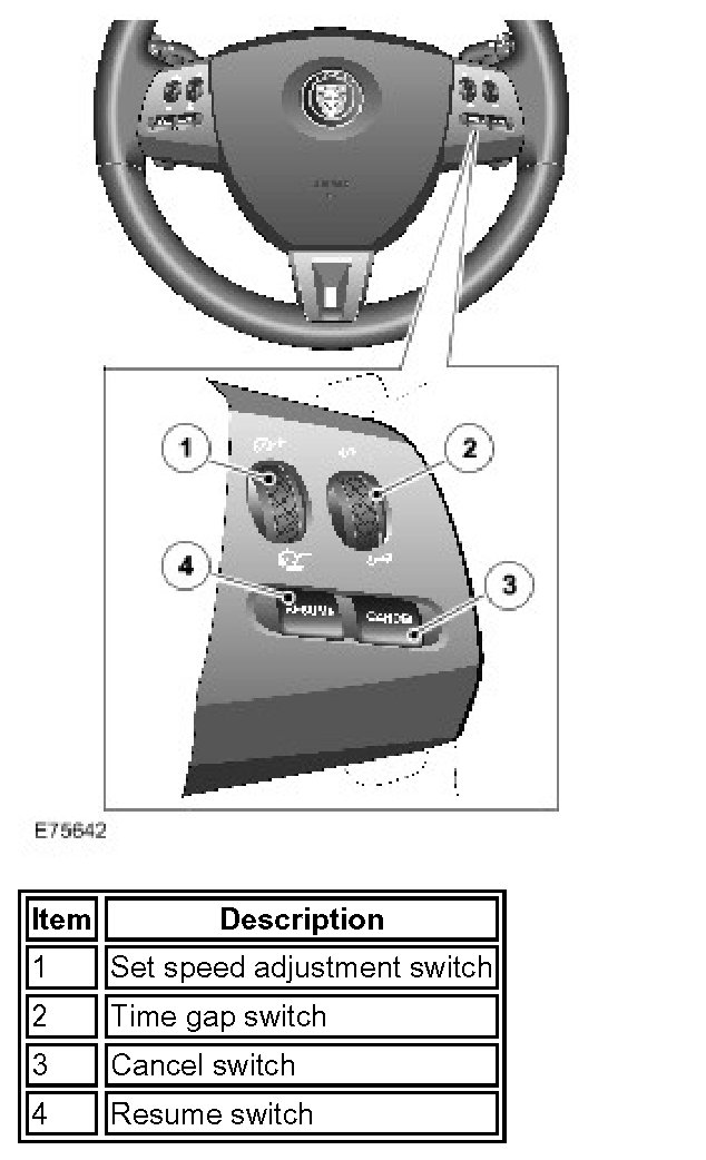 The Adaptive Speed control system is controlled from the steering wheel switches. The switches are the same as used for normal speed control with the addition of an extra time gap setting switch. The time gap setting switch allows the driver to adjust the time gap to one of four pre-set time gaps. The selected time gap is displayed in the vehicle message center.
