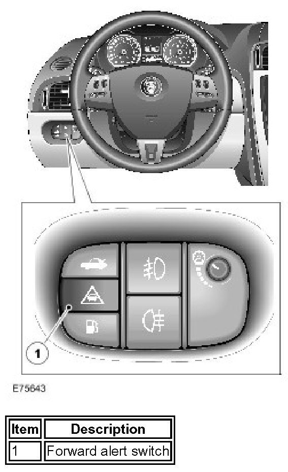 The forward alert switch is connected to the instrument cluster in a resistive ladder with the luggage compartment opening switch and the fuel filler flap switch. The instrument cluster sends the forward alert information to the Adaptive speed control module on the CAN bus.