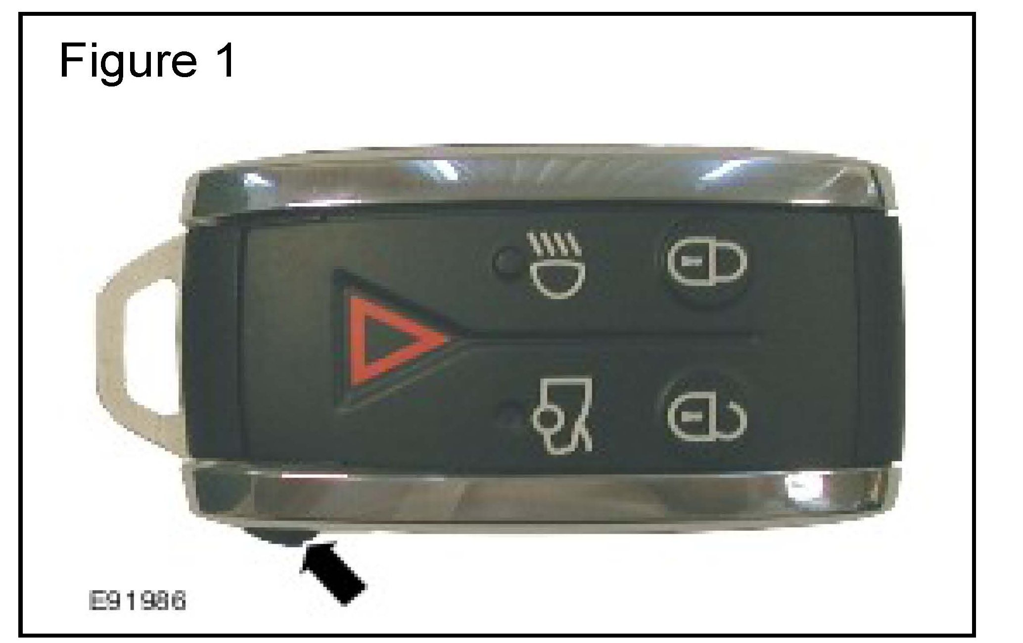 The green printed circuit board, battery or the battery contacts (arrowed in E91988) may NOT be touched during the work procedure. Oil or contamination on either can affect the key fob performance.