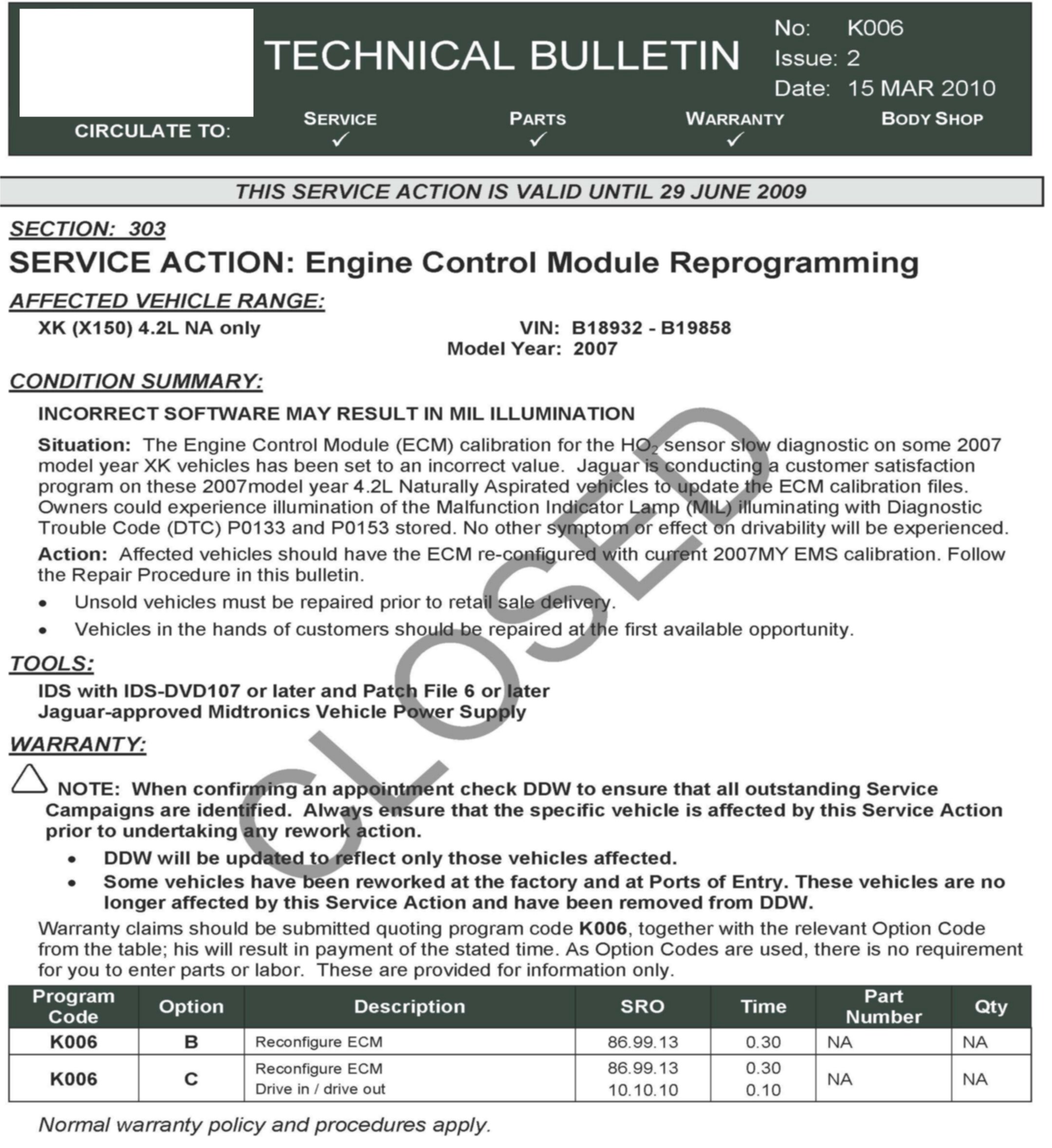 SERVICE ACTION K006 IS CLOSED EFFECTIVE 29 JUNE 2009.
