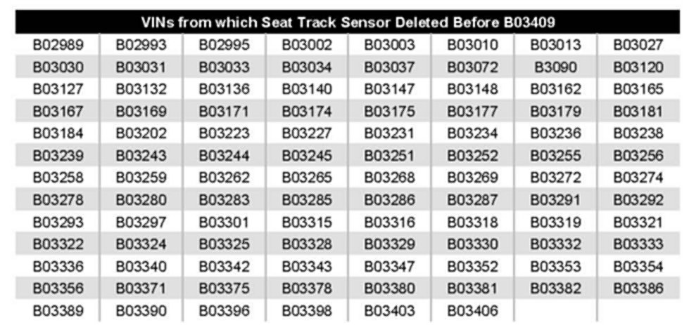 ^ "Is the passenger's seat track position restraints sensor fitted" - VIN between B00001 to VIN B03408 NOT listed in Table - select "Fitted"