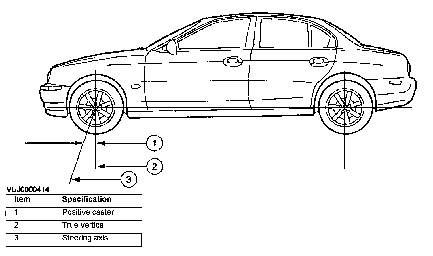 Caster is the deviation from vertical of an imaginary line drawn through the ball joints when viewed from the side. The caster specifications in this section will give the vehicle the best directional stability characteristics when loaded and driven. The caster setting is not related to tire wear.