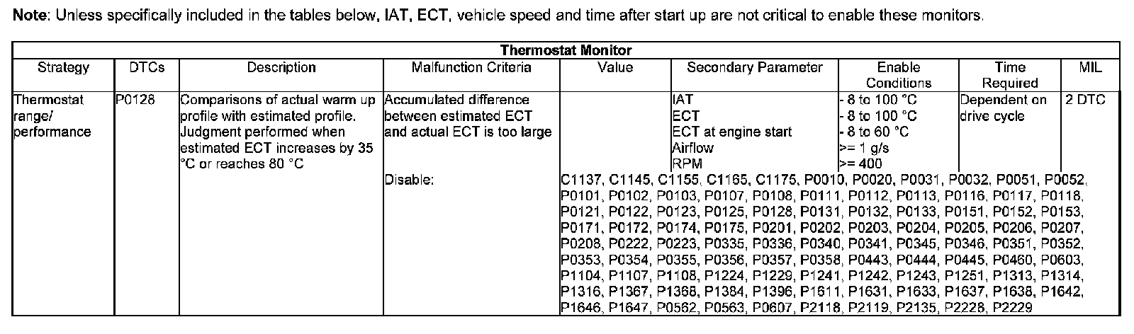 The monitor operates once per trip and is not a continuous monitor. Every 1 second the monitor compares the actual ECT with an estimated temperature. This is derived from a model and accumulates the error between the two temperatures. The model to calculate the estimated ECT has look-up tables, which use various engine and vehicle parameters to derive compensation values by which the estimated ECT is increased or decreased. These look-up tables takes into account engine speed, engine airflow, vehicle speed and temperature difference between IAT and ECT.