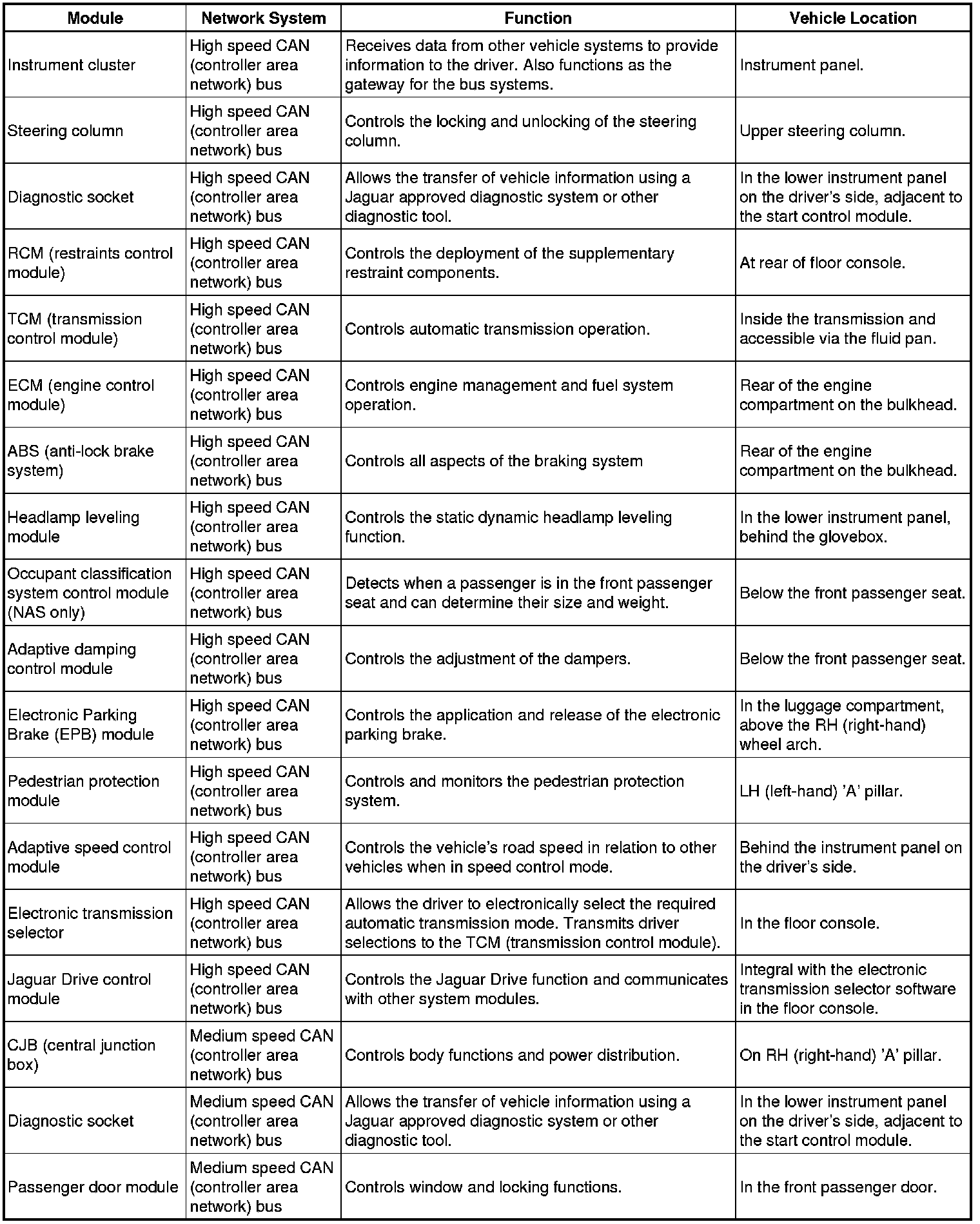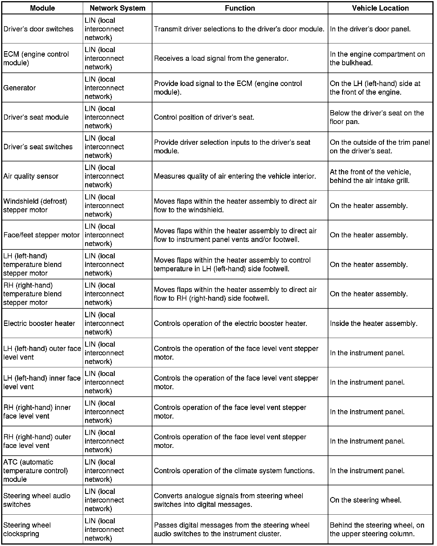 The following table shows each vehicle control module, the network system to which it is connected, its function and location in the vehicle.