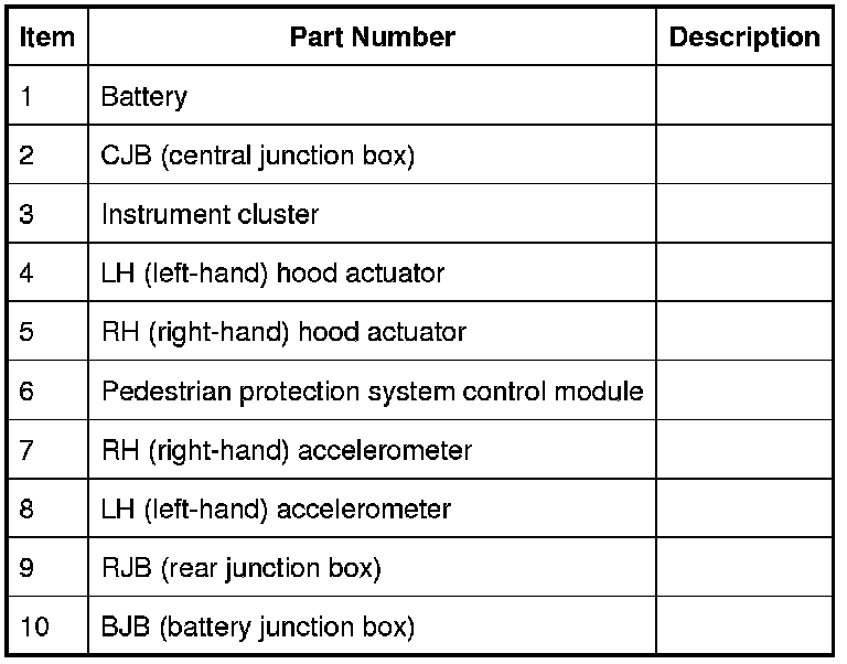If the pedestrian protection system control module detects a fault with the system, it outputs a message on the high speed CAN (controller area network) bus to the instrument cluster message center. On receipt of this, the message center will display the message 'CHECK PEDESTRIAN SYSTEM'.