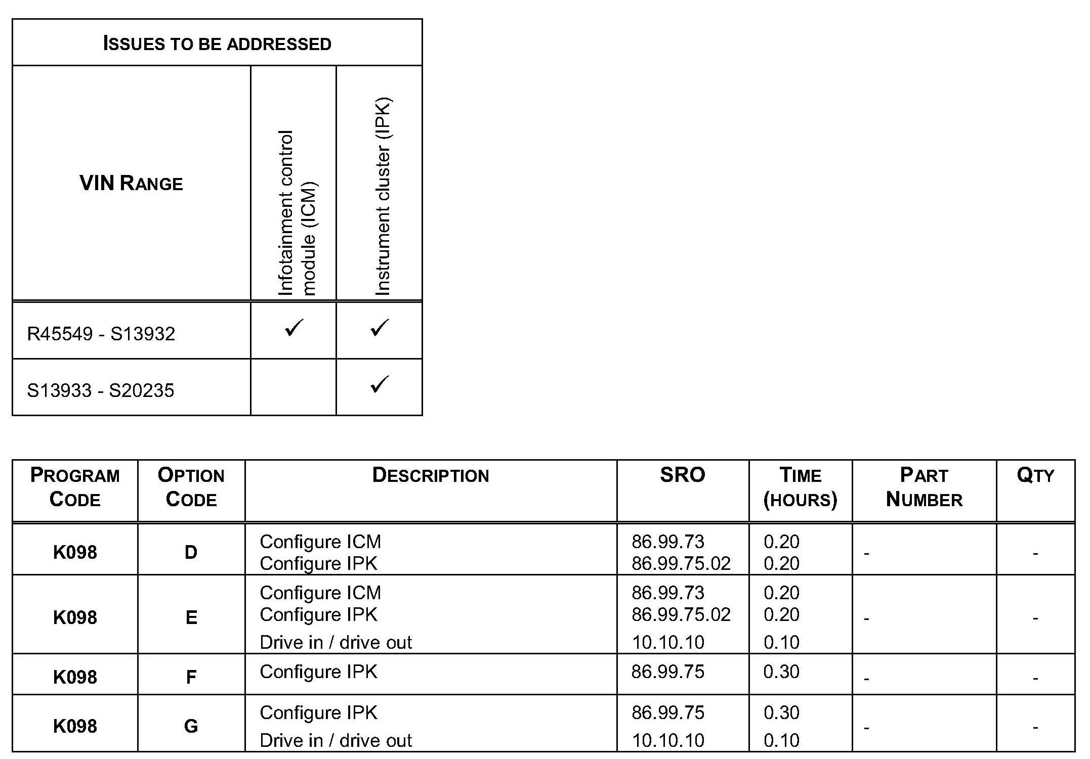 Warranty claims must be submitted quoting Program Code K098 together with the relevant Option Code from the table. The SRO and part information listed have been included for information only.