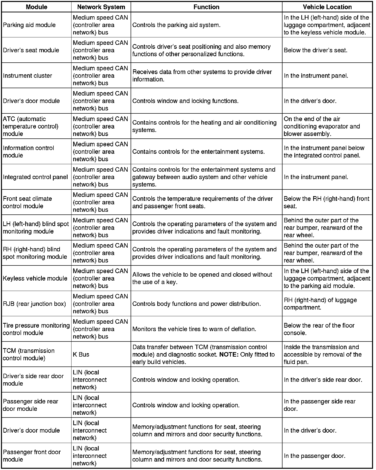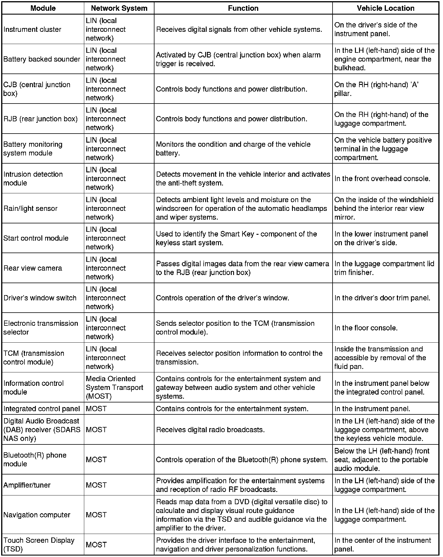 The following table shows each vehicle control module, the network system to which it is connected, its function and location in the vehicle.