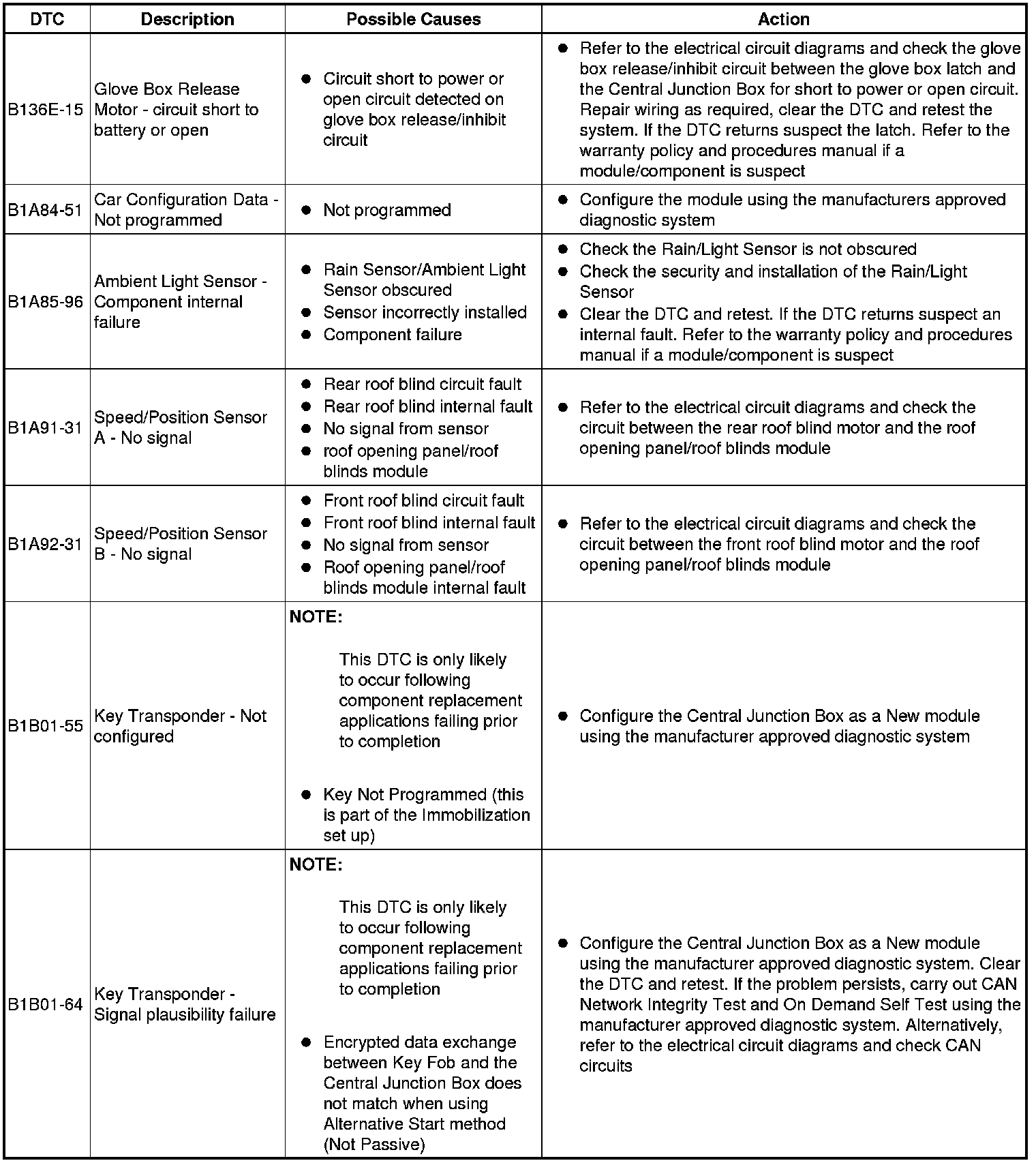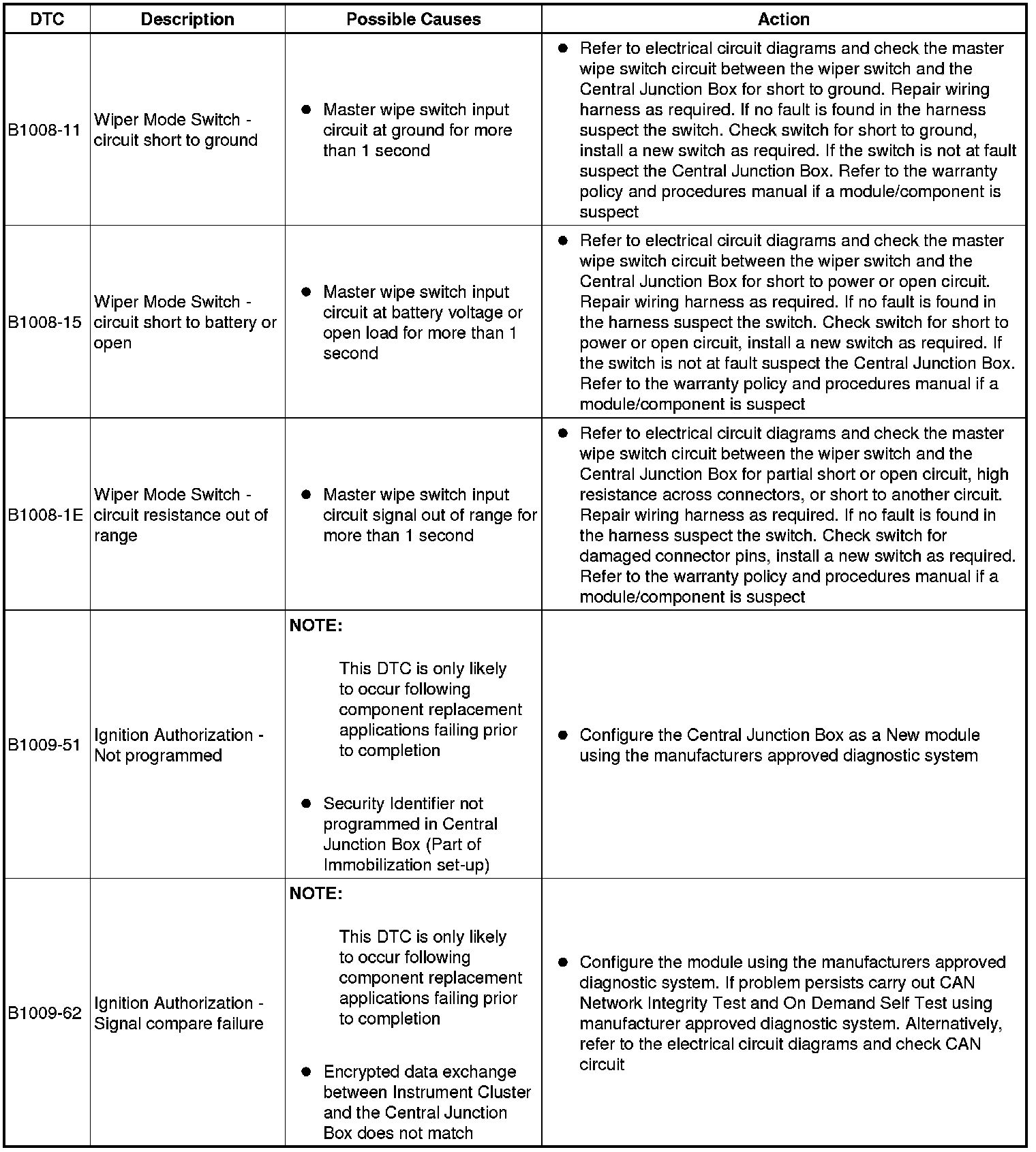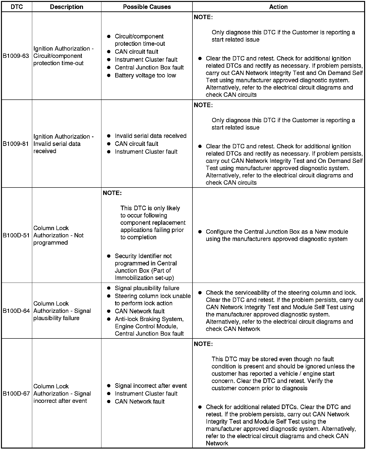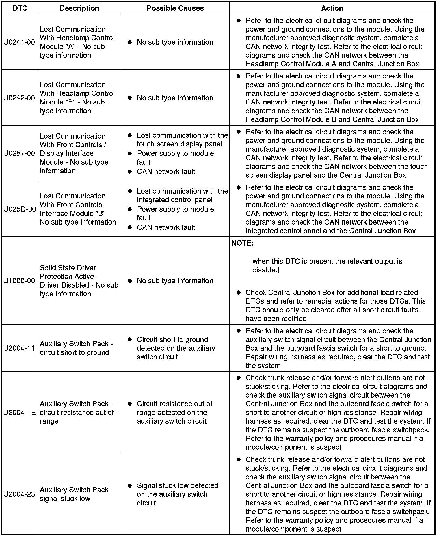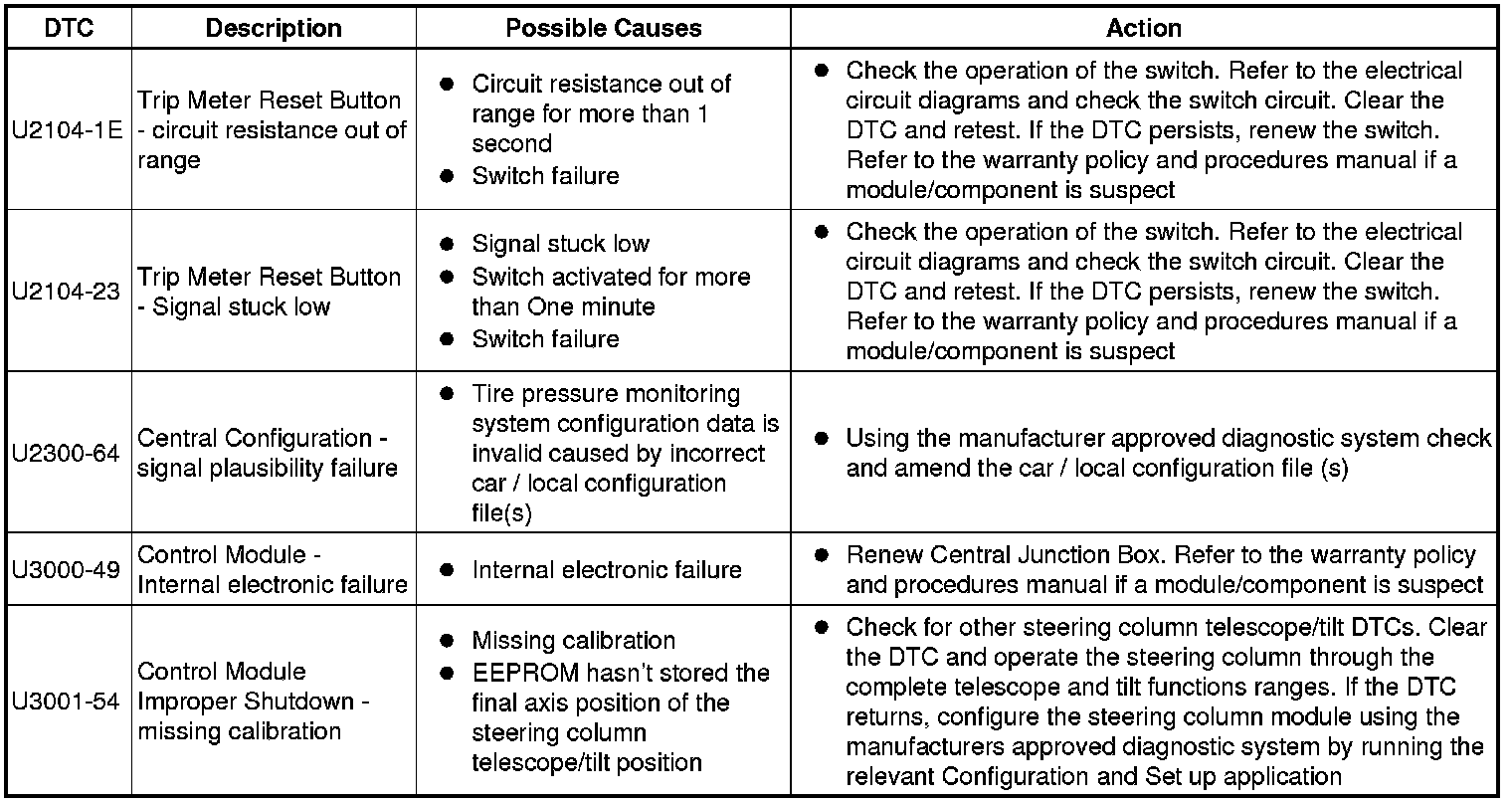 The table below lists all Diagnostic Trouble Codes (DTCs) that could be logged in the Central Junction Box, for additional Diagnosis and Testing information refer to the relevant Diagnosis and Testing Section. For additional information, refer to Communications Network