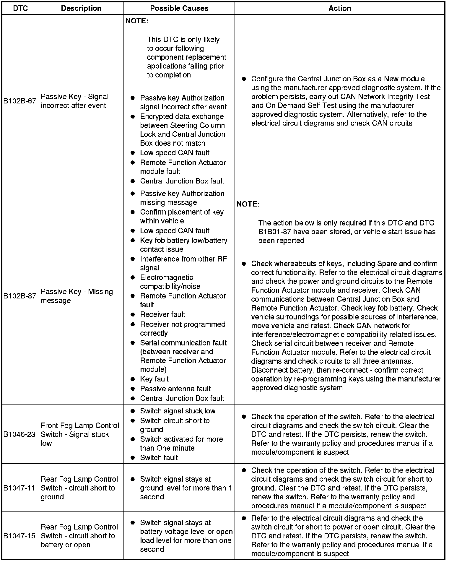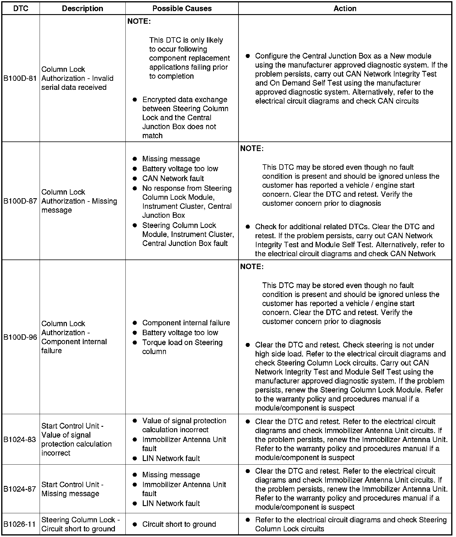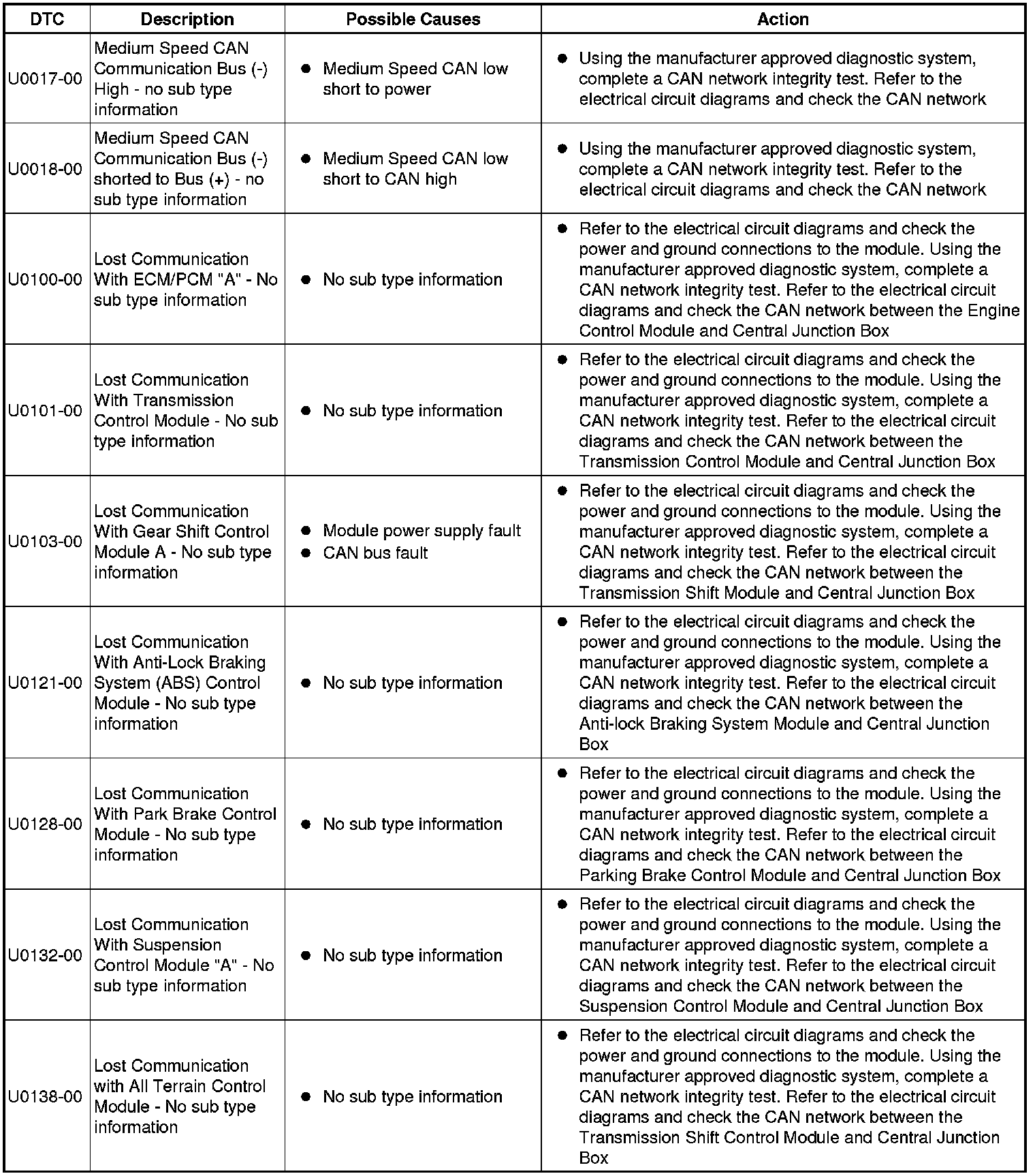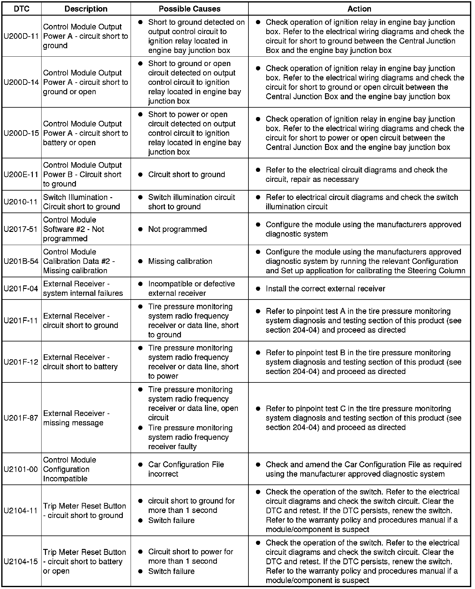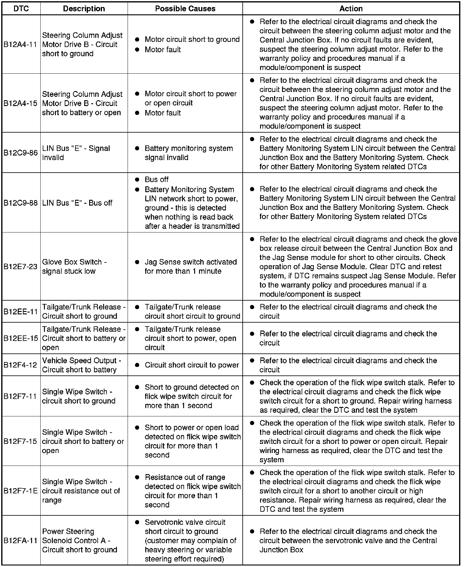 The table below lists all Diagnostic Trouble Codes (DTCs) that could be logged in the Central Junction Box, for additional Diagnosis and Testing information refer to the relevant Diagnosis and Testing Section. For additional information, refer to Communications Network