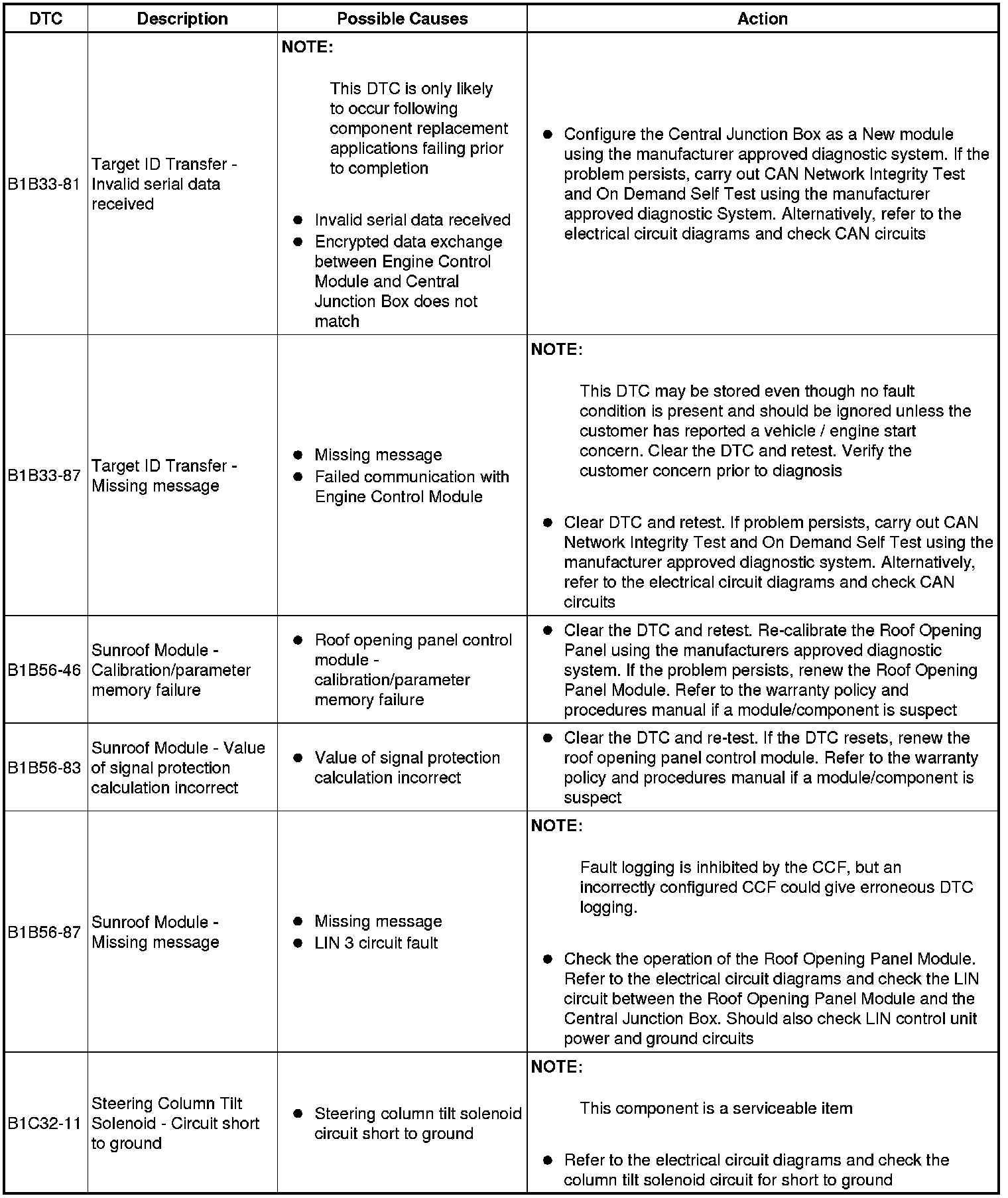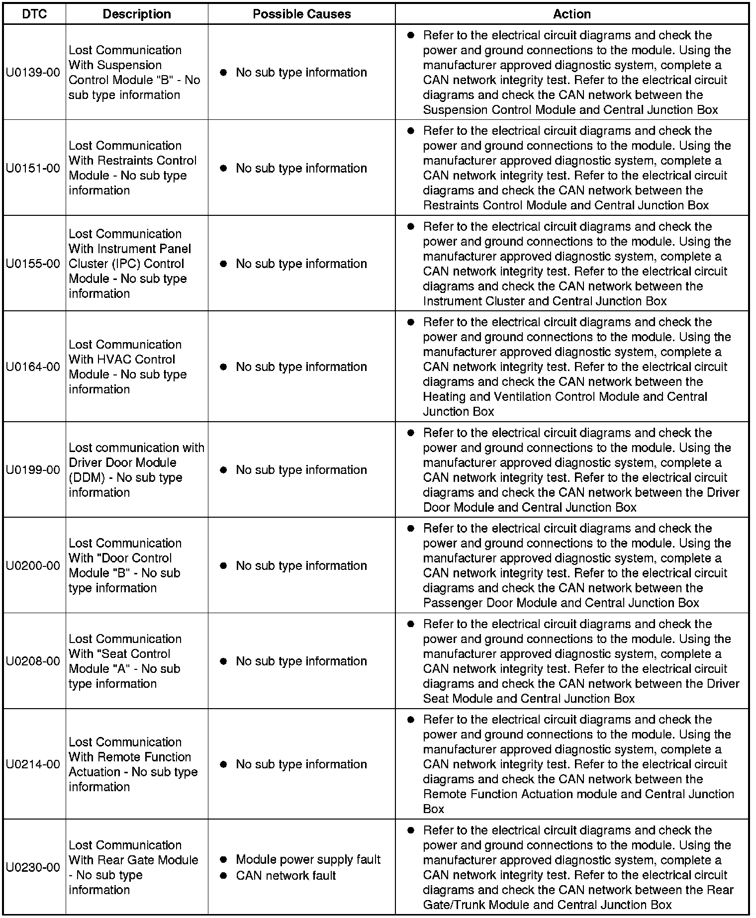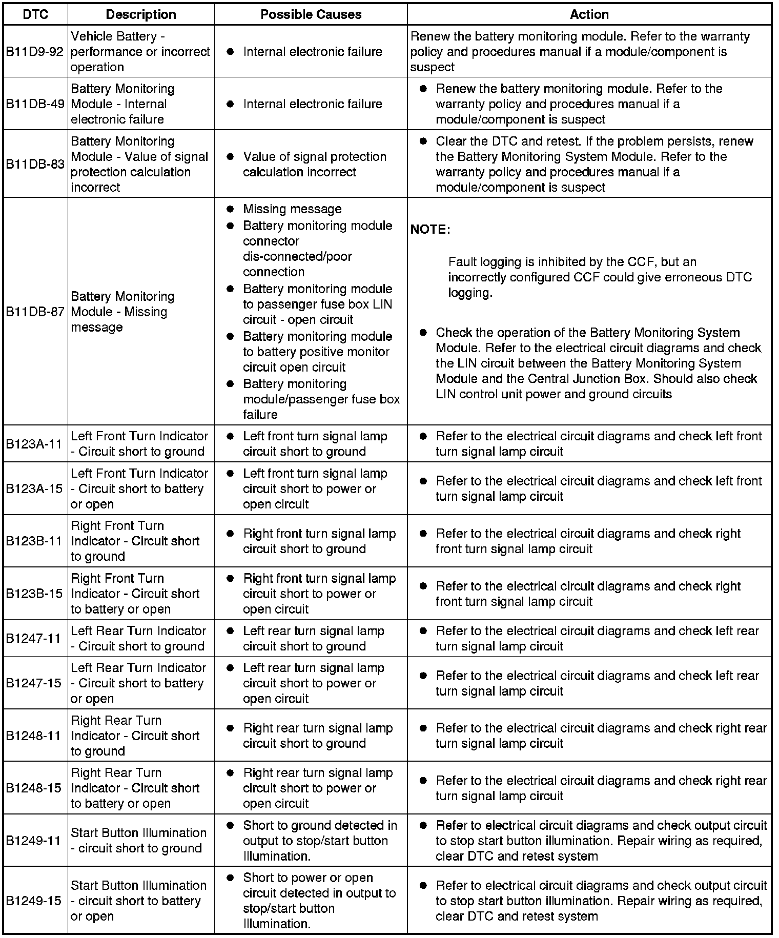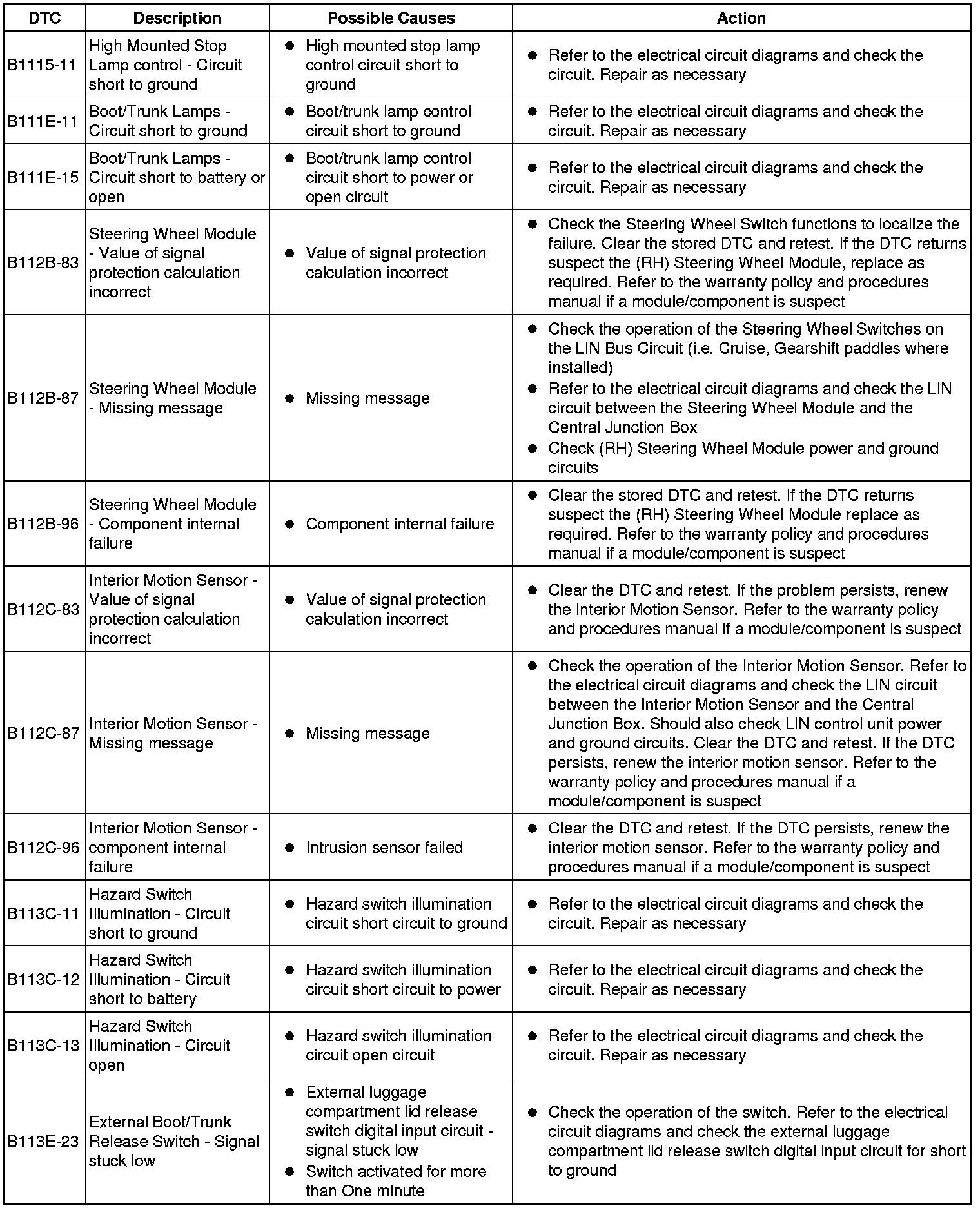 The table below lists all Diagnostic Trouble Codes (DTCs) that could be logged in the Central Junction Box, for additional Diagnosis and Testing information refer to the relevant Diagnosis and Testing Section. For additional information, refer to Communications Network