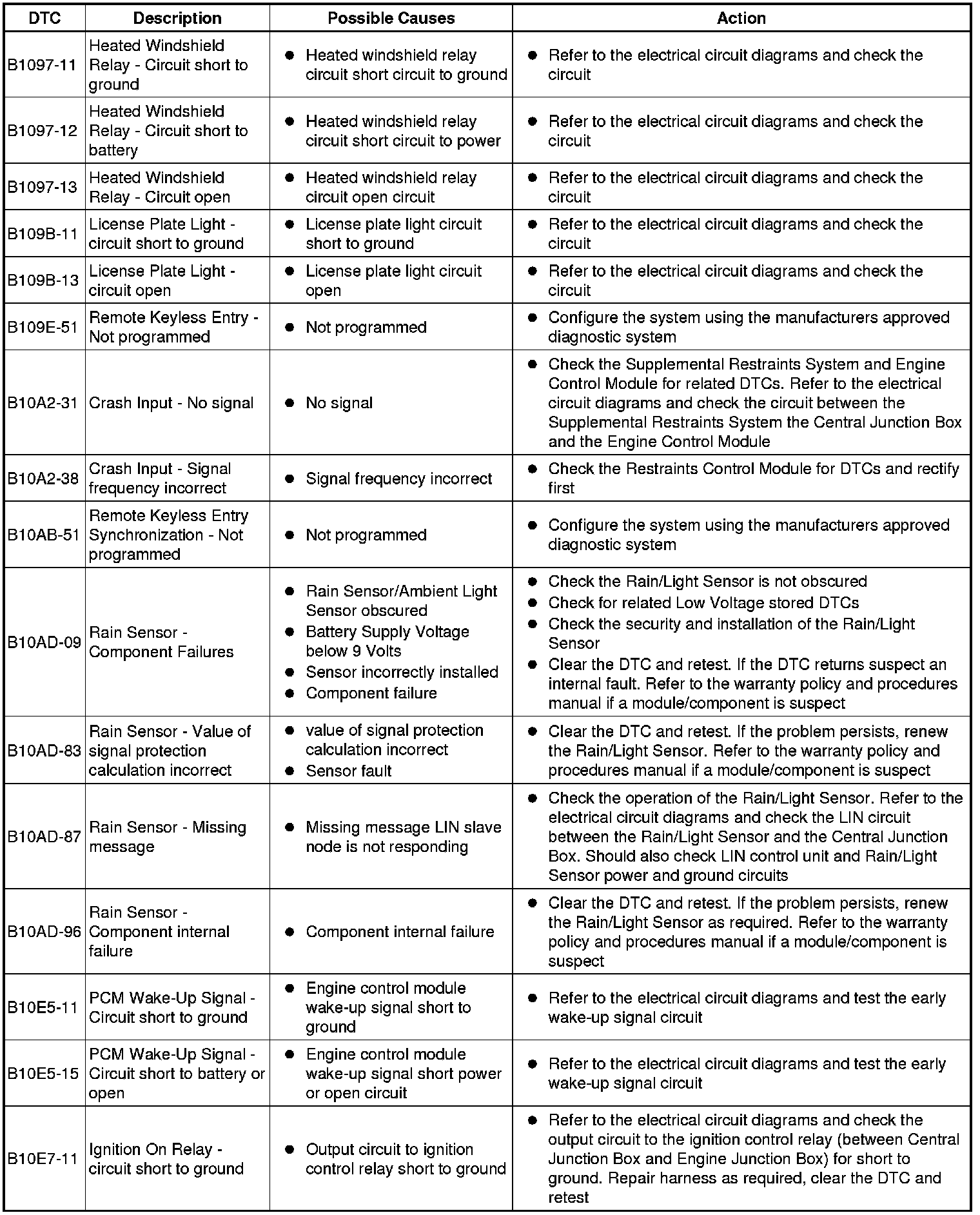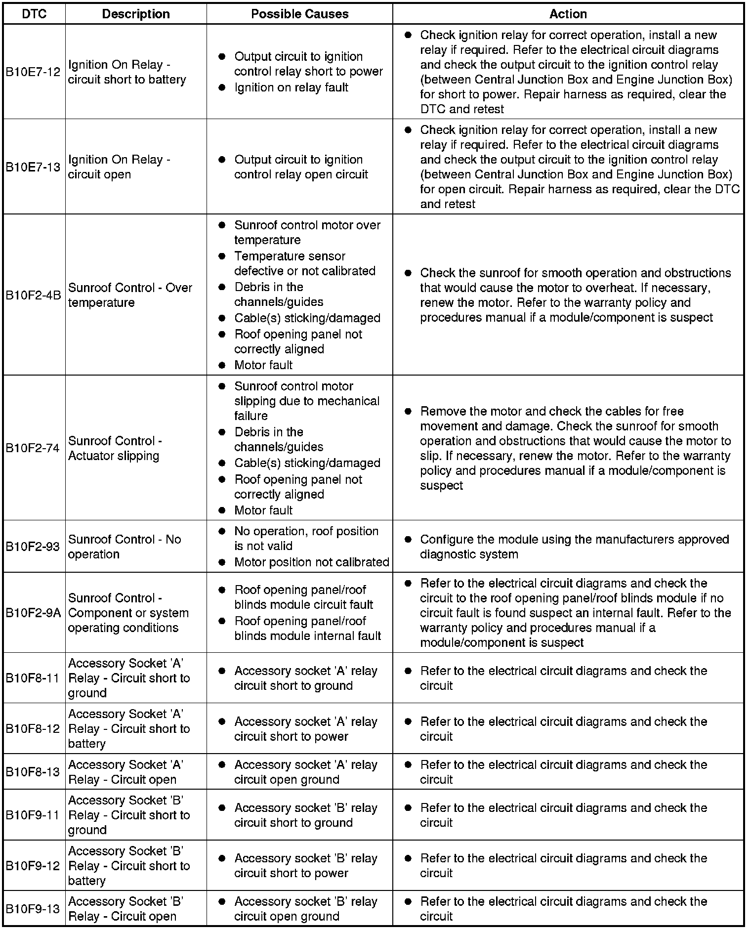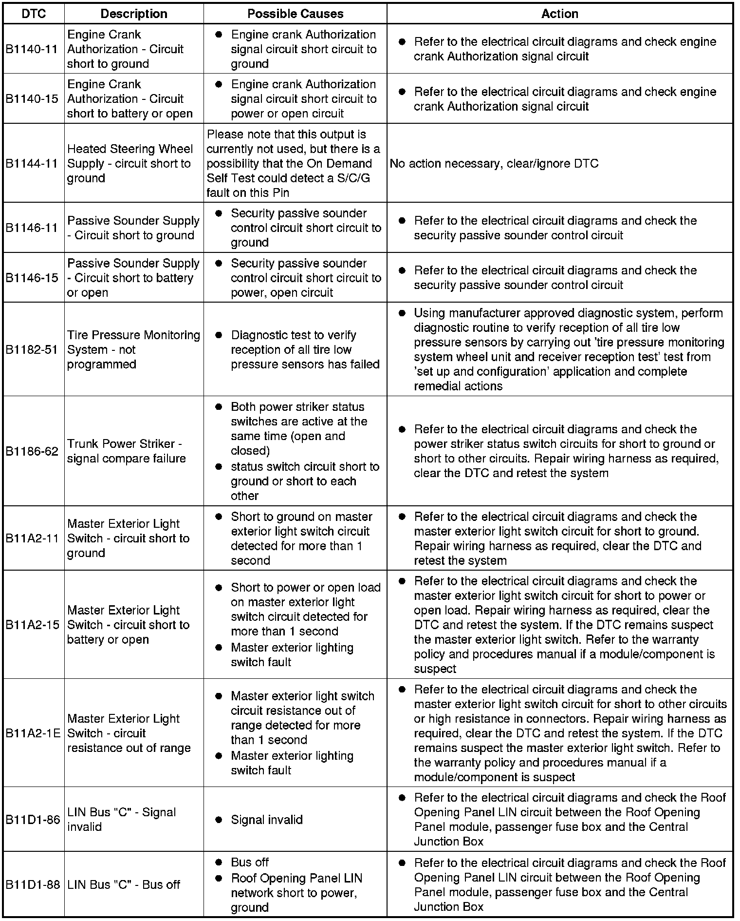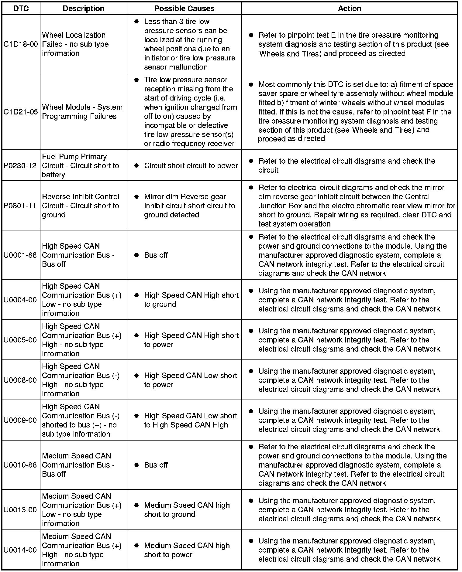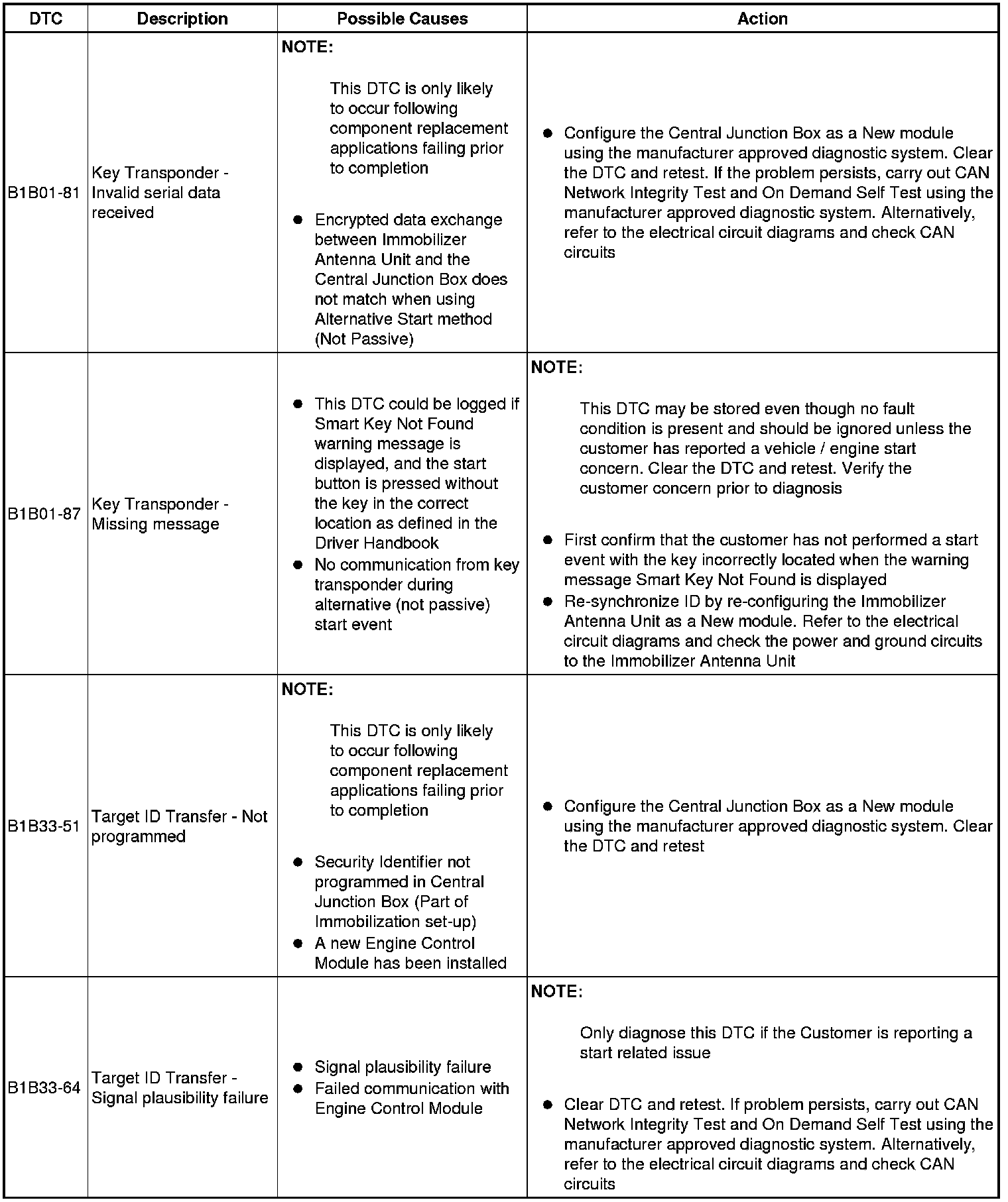 The table below lists all Diagnostic Trouble Codes (DTCs) that could be logged in the Central Junction Box, for additional Diagnosis and Testing information refer to the relevant Diagnosis and Testing Section. For additional information, refer to Communications Network