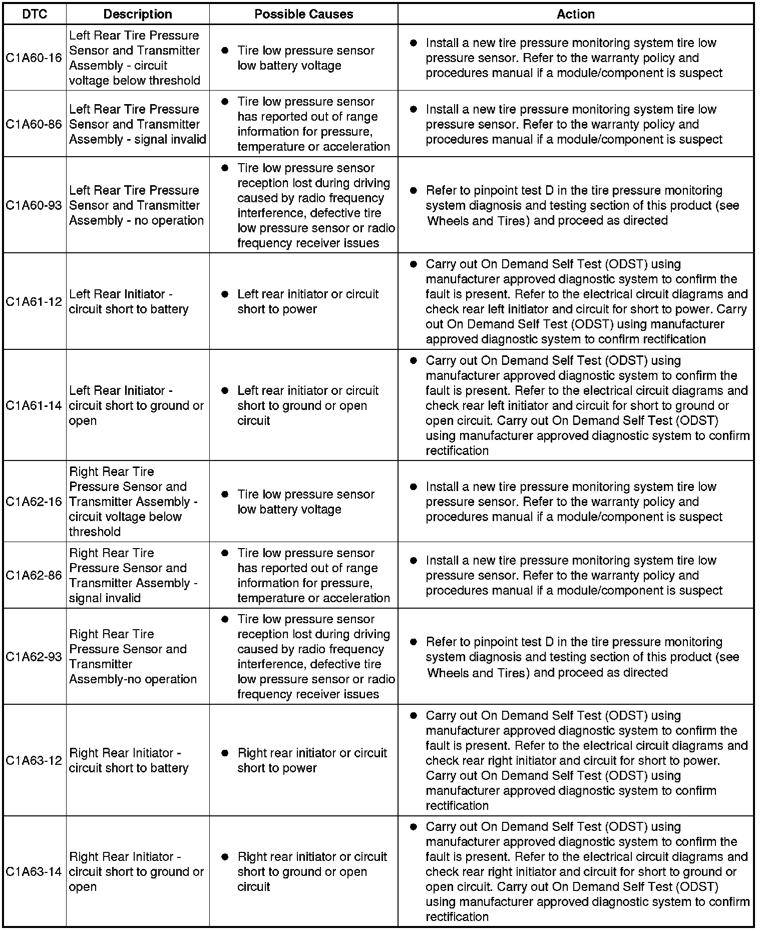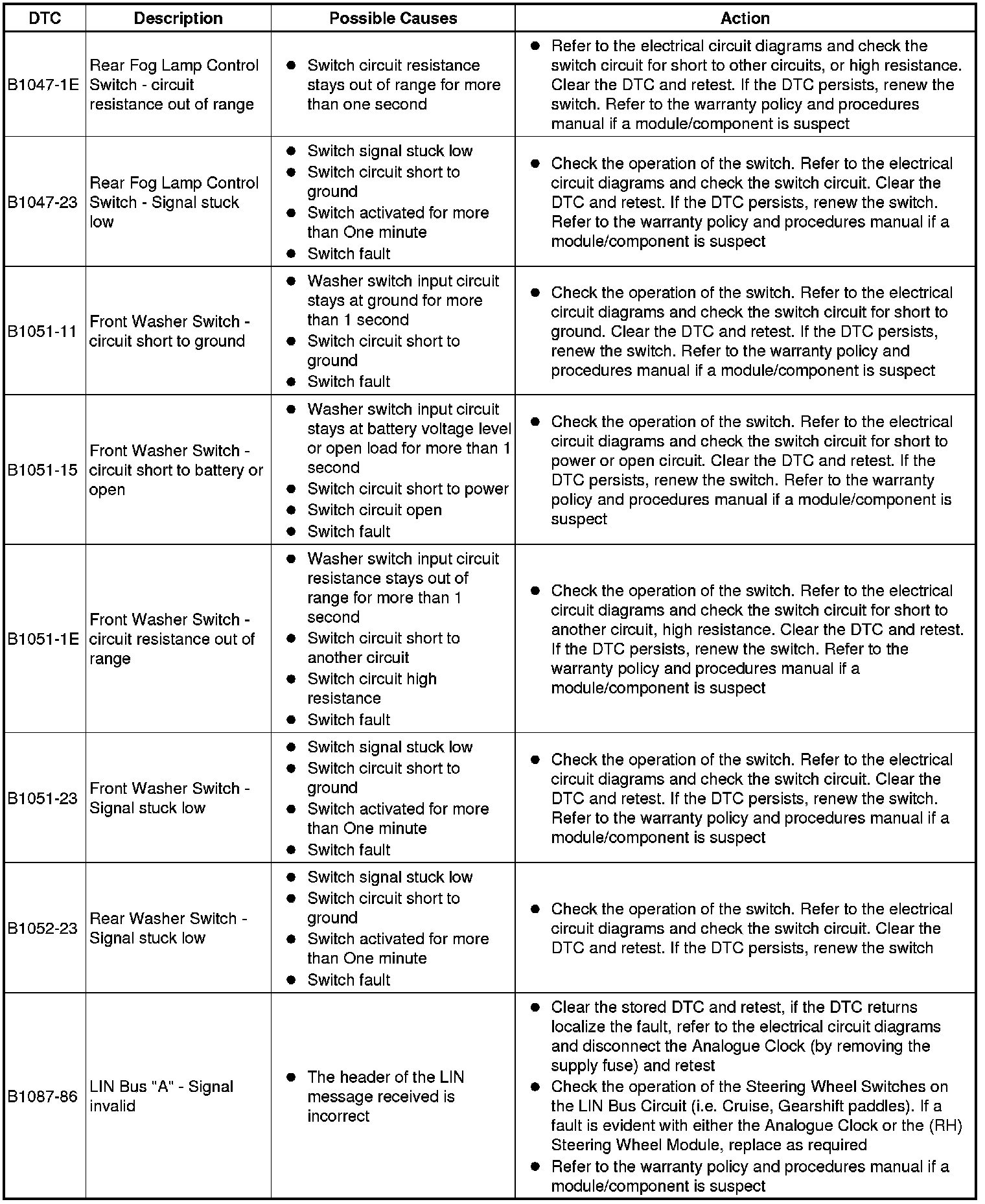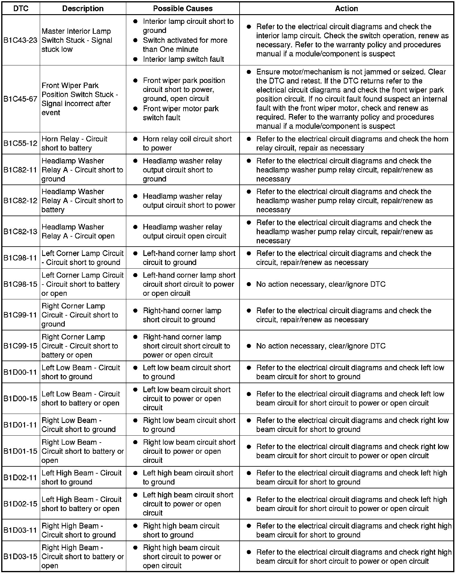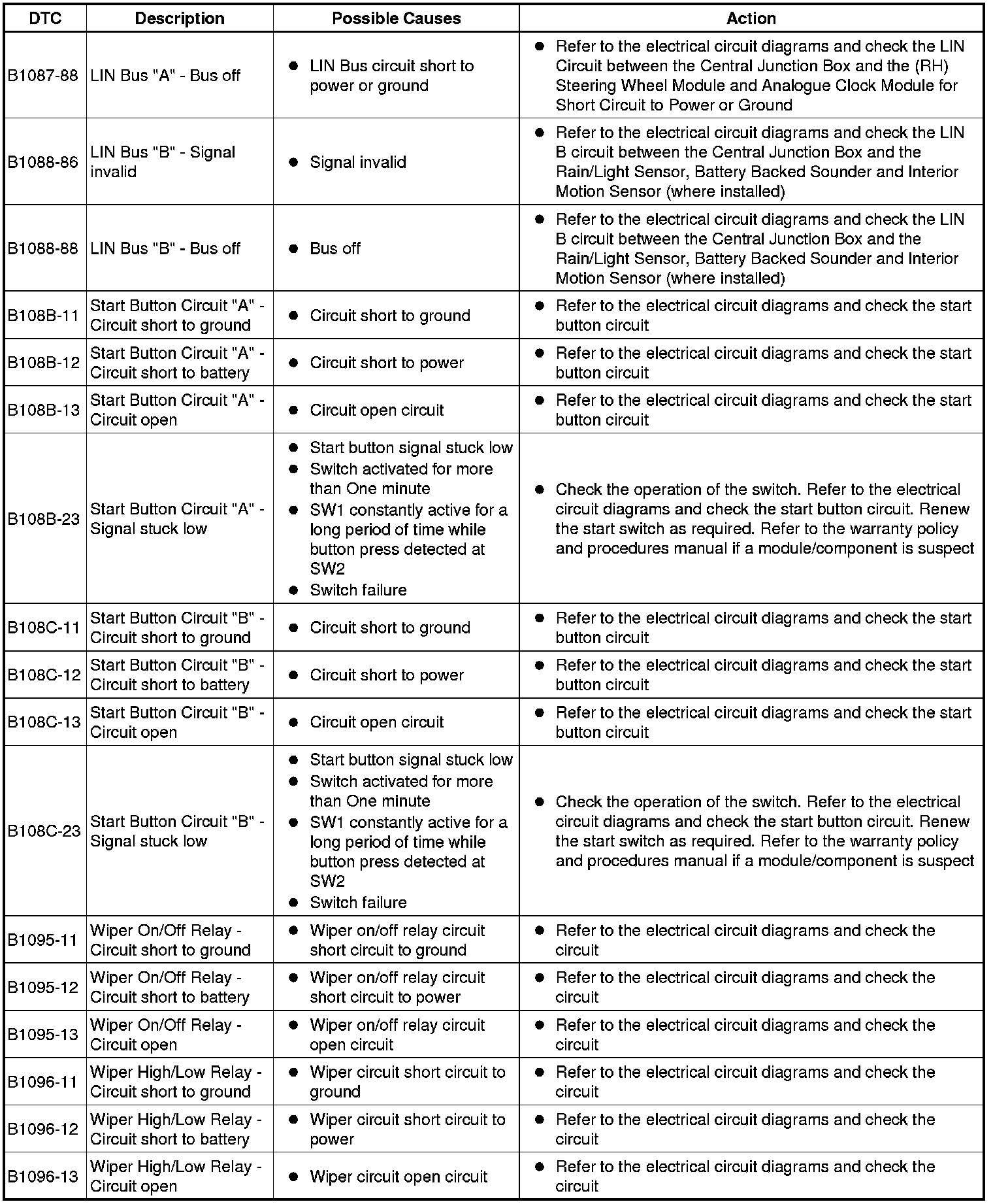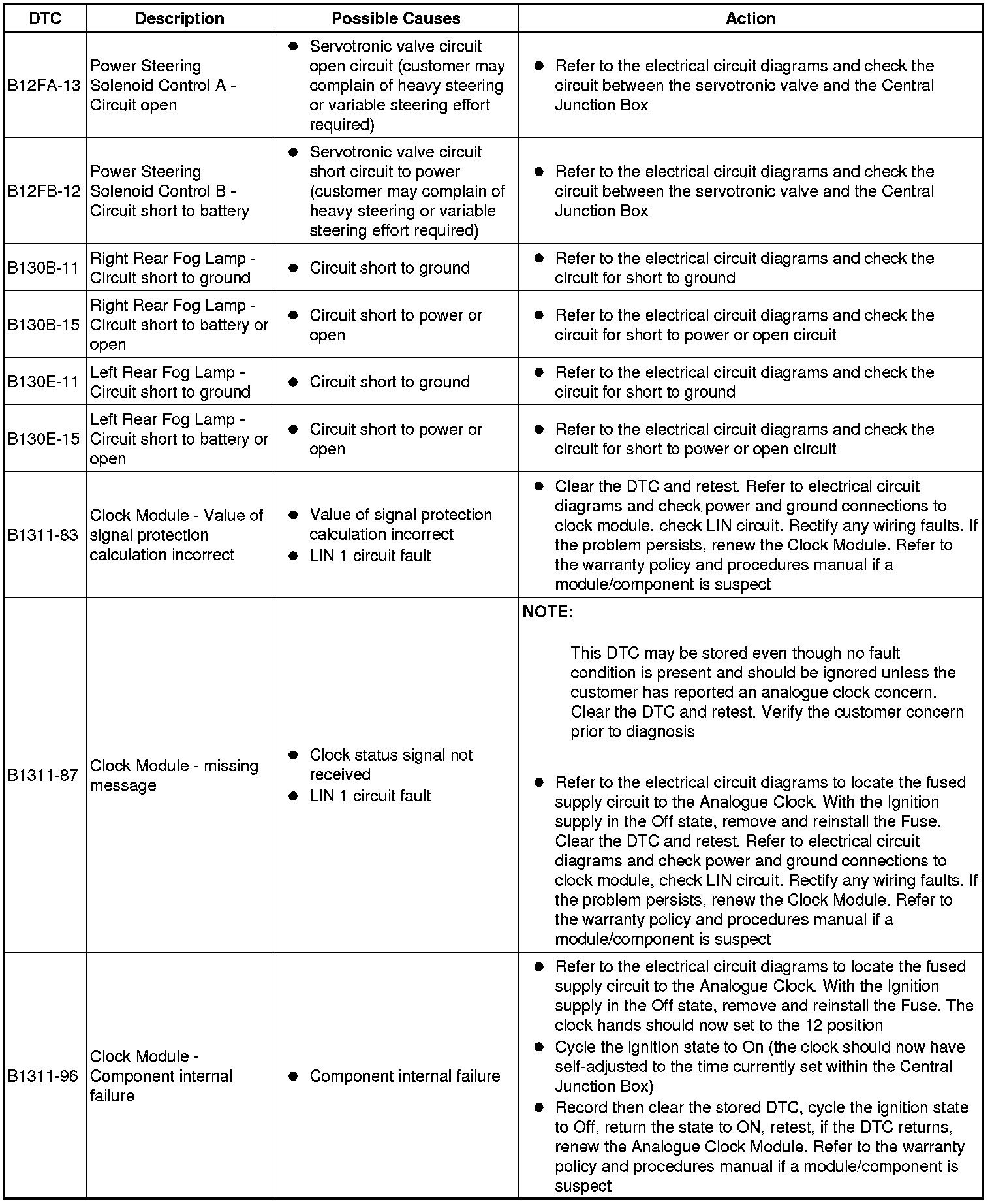 The table below lists all Diagnostic Trouble Codes (DTCs) that could be logged in the Central Junction Box, for additional Diagnosis and Testing information refer to the relevant Diagnosis and Testing Section. For additional information, refer to Communications Network